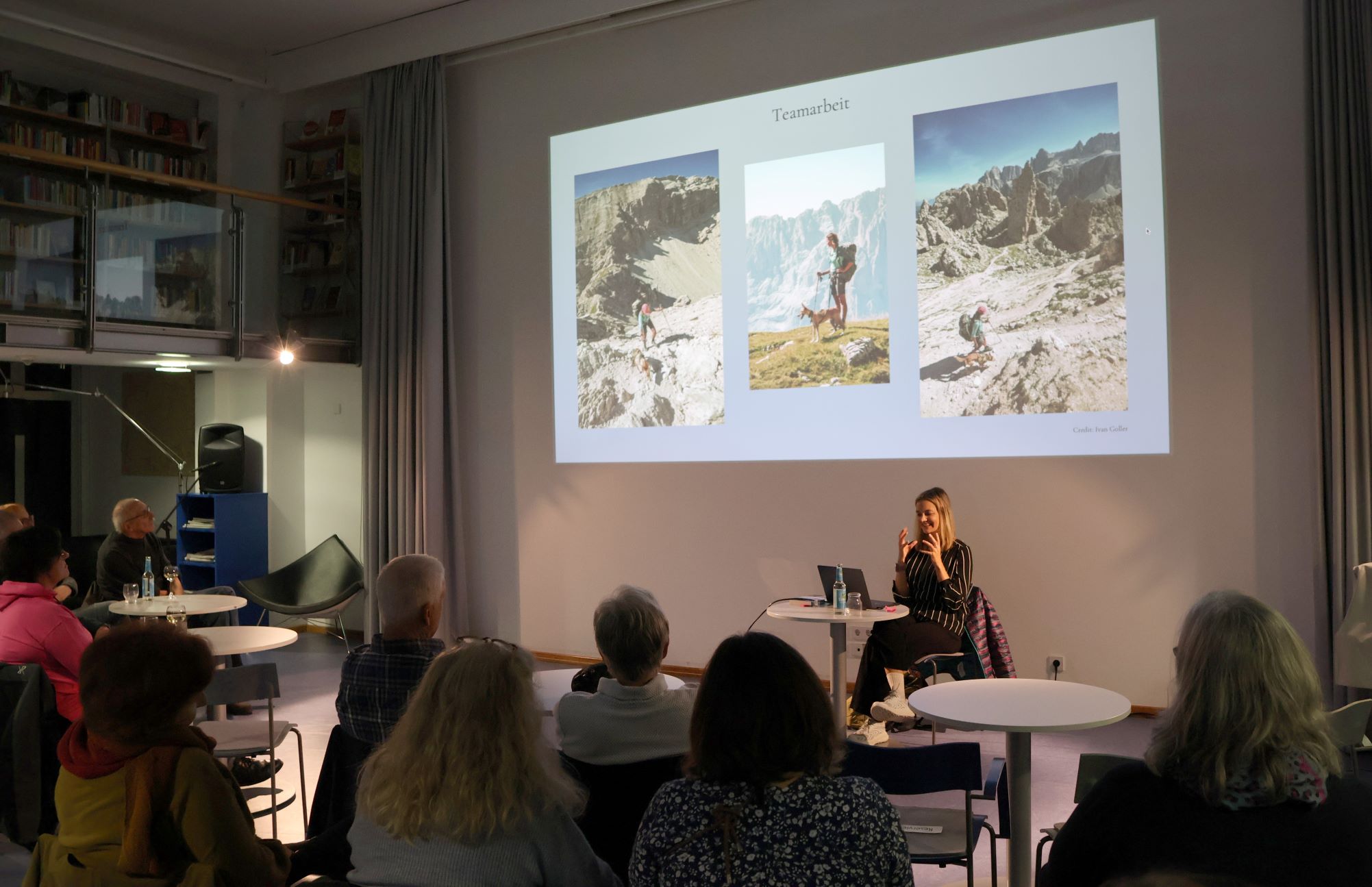 Zunächst stellt sich die Autorin und Reisejournalistin vor und spricht darüber, wie Ralfi in ihr Leben getreten ist: über ein Tierheim in Portugal. Der Portugiesische Podengo sei zuvor aus einer Tötungsstation gerettet worden. Damals, mit rund zehn Monaten, habe sie ihn adoptiert und nach Deutschland überführt. „Er ist eine witzige Mischung aus ängstlich und selbstbewusst“, charakterisiert ihn Nadine Regel lachend. Und er sei ein Rockstar, denn er klettere gerne – worauf später noch näher eingegangen wird. Das „Wohoo“ sei sein Erkennungsmerkmal, ein Laut, den Ralfi von sich gebe, wenn er überrascht oder aufgeregt sei. Zum Beispiel, wenn er einem Murmeltier begegne – was in den Alpen nicht unüblich sei.