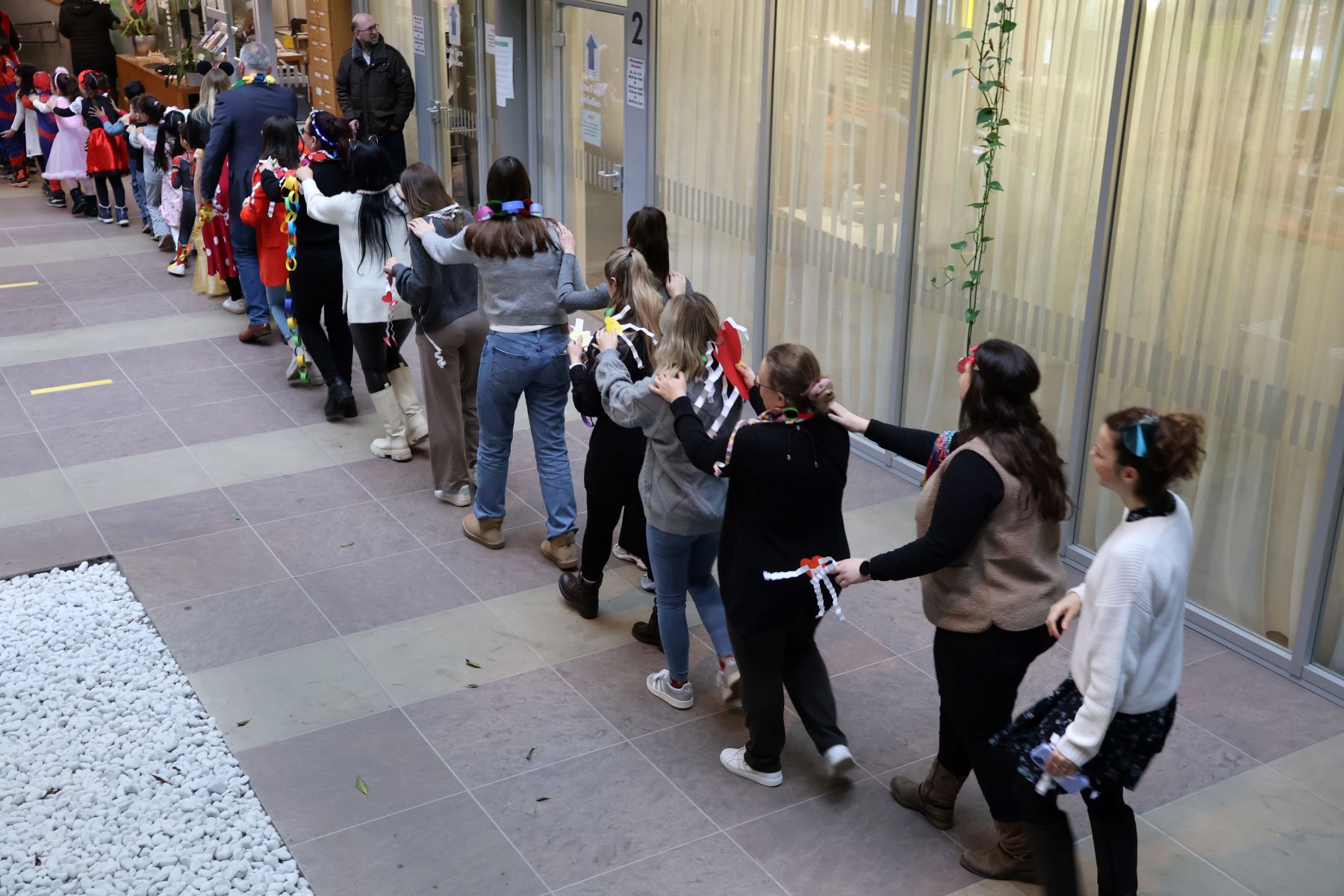 Die Kinder wiederum luden zur Polonaise durch das Rathaus ein, der sich zahlreiche Erwachsene anschlossen. Wieder im Foyer angekommen, gab es noch eine kleine Tanzeinlage zum Lied „Das rote Pferd“, bevor es mit einem dreifachen „Helau“ wieder zurück in die Kindergärten ging.