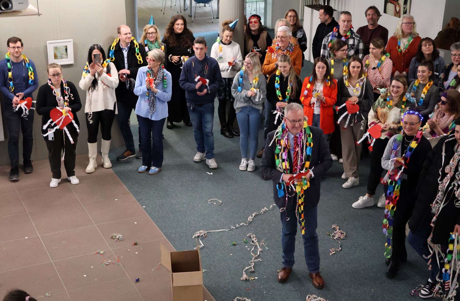 Die Kinder versammelten sich nach ihrer Ankunft im Rathausfoyer und sangen zur Begrüßung ein Ständchen: „Walldorf ist ’ne schöne Stadt – jupeidi, jupeida“, das sich direkt als Ohrwurm etablierte und bestens ankam. Als schöne Geste verteilten die Kinder selbst gebastelte Herzen und Ketten an die Mitarbeiterinnen und Mitarbeiter.