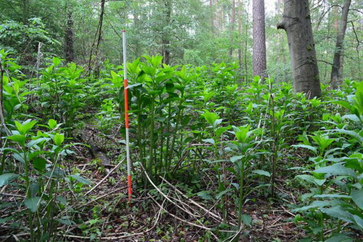 Denn aus jeder Kermesbeere schießen nach einigen Jahren Wachstum im Durchschnitt 10 Sprossen aus, an denen sich jeweils bis zu 15.000 Samen bilden können. Bei ungehindertem Wachstum lagern dann schon nach wenigen Jahren Unmengen von Samen im Boden, die an lichten Standorten zu einer invasiven Vermehrung der Kermesbeere führen und der Kiefernwald auf Dauer keine Chance mehr hat.