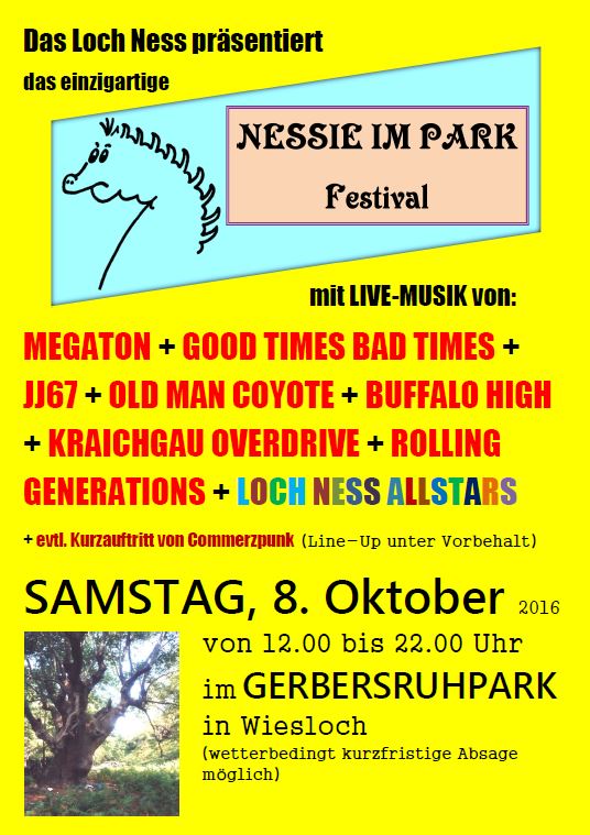 Am Samstag, den 8.Oktober, zieht es Nessie in den Gerbersruhpark in Wiesloch, um ein besonderes kulturelles Highlight zu erleben. Live-Musik gibt es von 12.00 bis 22.00 Uhr.