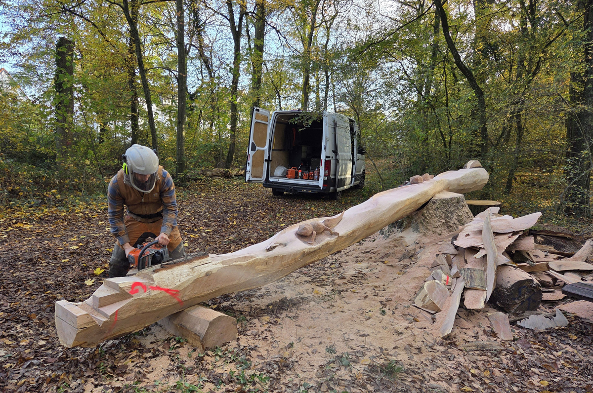 Der lokale Motorsägenkünstler Micha Reichert aus Mönchzell setzte das Projekt in nur drei Tagen um. Entstanden ist die „Stamm-Murmelbahn – Lebenszyklus eines Frosches“, die den Naturerlebnispfad am Waldspielplatz um eine interaktive Attraktion bereichert. Kinder können ihre Murmeln entlang des kunstvoll bearbeiteten Stammes rollen lassen und dabei die Themen Natur und Wald spielerisch erleben.