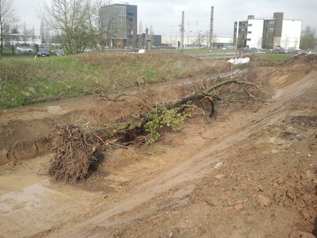 Weitere gefällte Bäume werden als sogenanntes Totholz mit Wurzelballen in den neuen Leimbach eingebaut und dienen den Lebewesen im Wasser als Kinderstube oder Nahrungsquelle.