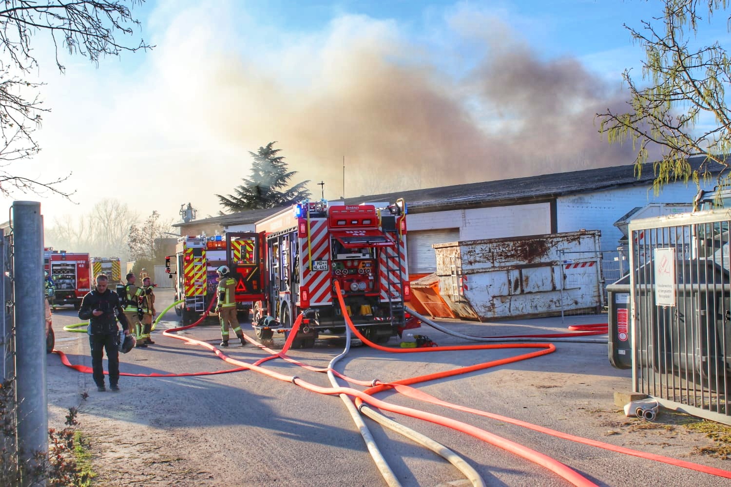 Die Flammen griffen schnell um sich und setzten die gesamte Halle in Brand. Eine benachbarte Halle konnte erfolgreich durch Einsatzkräfte der Feuerwehr geschützt werden.