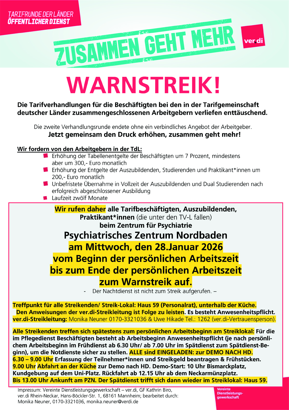 Am Mittwoch, 28. Januar, ruft ver.di die Beschäftigten des Psychiatrischen Zentrums Nordbaden (PZN) Wiesloch zu einem ganztägigen Streik auf. Die Psychiatrie-Mitarbeitenden beteiligen sich dabei solidarisch am bundesweiten Campus-Streiktag mit Demo in Heidelberg.