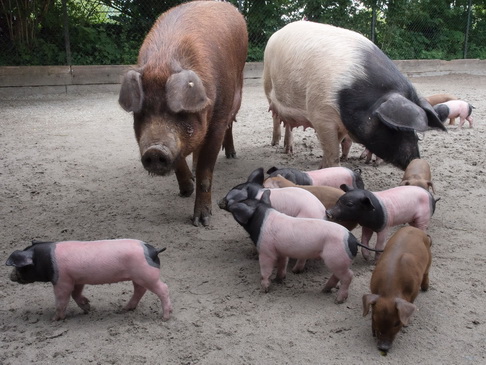 Schwein Juli brachte vor zwei Wochen gleich 14 Ferkel auf die Welt und ist eine sehr fürsorgliche Mutter. Sie gehört der alten Haustierrasse Schwäbisch–Hällisches Schwein an. Sie ist gut an der schwarzen Färbung von Kopf und Hinterteil erkennbar, die sie auch allen ihren Ferkeln vererbt hat.