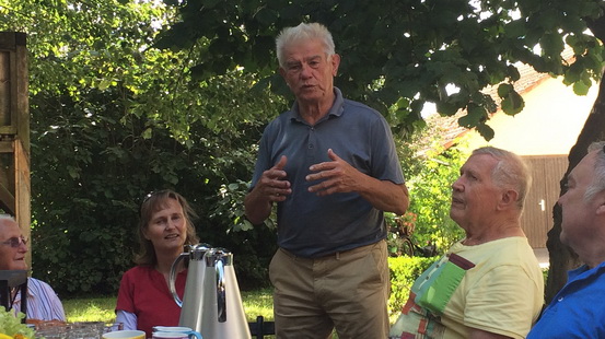 Fritz Sandritterzeigte der Gruppe sein Schatthausen, mit der alten Bahnlinie und dem Viadukt, das Wasserschloss mit dem Mühlenrad und dem neu entstehenden Dorfgemeinschaftshaus „Hohenhardter 7“.