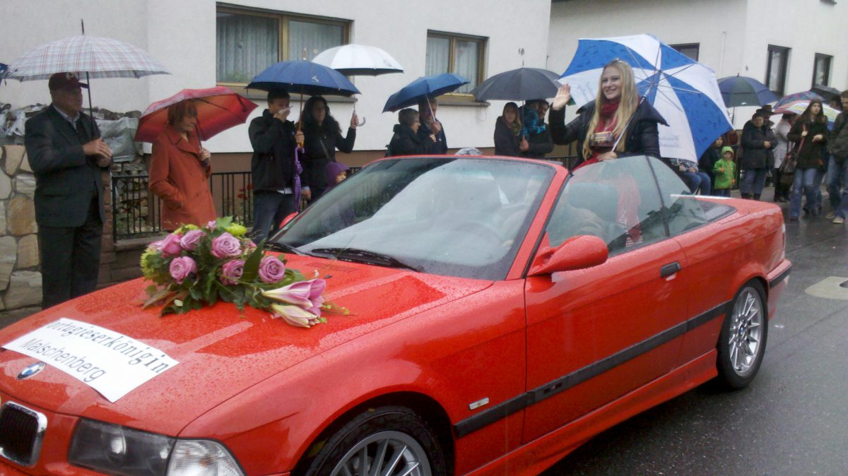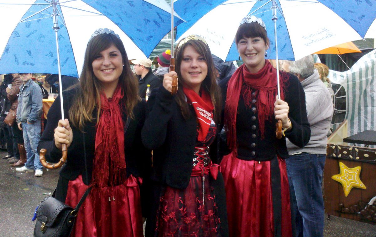 Die Portugieserkönigin winkte trotz Nässe lächelnd dem Volke zu. Es war kein guter Tag für die Schausteller, am Sonntag tagsüber standen viele Kaursells  still, ohne ihre üblichen Runden zu drehen. Um so mehr Ansturm konnten alle Zeltwirte erwarten. Unter einem Dach und beim guten Wein konnte man dort gemütlich nach Herzenslust feiern.  Die Vereine verwöhnten ihre Gäste mit allen möglichen Kerweköstlichkeiten, von Knödel bis zu Crepes. Und obwohl am Montag um 19Uhr der traditionelle Kerwebobbele zum  Abschluss im Löwenhof verbrannt wird, kann man noch bis spät in den Montagabend weiterfeiern. Viel Spass wünschen wir dabei!
