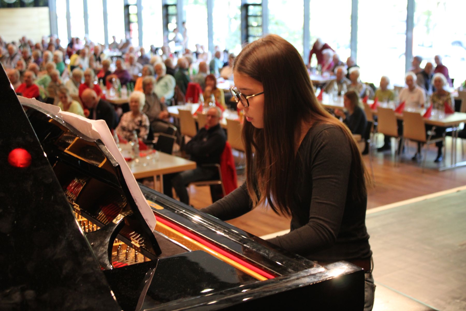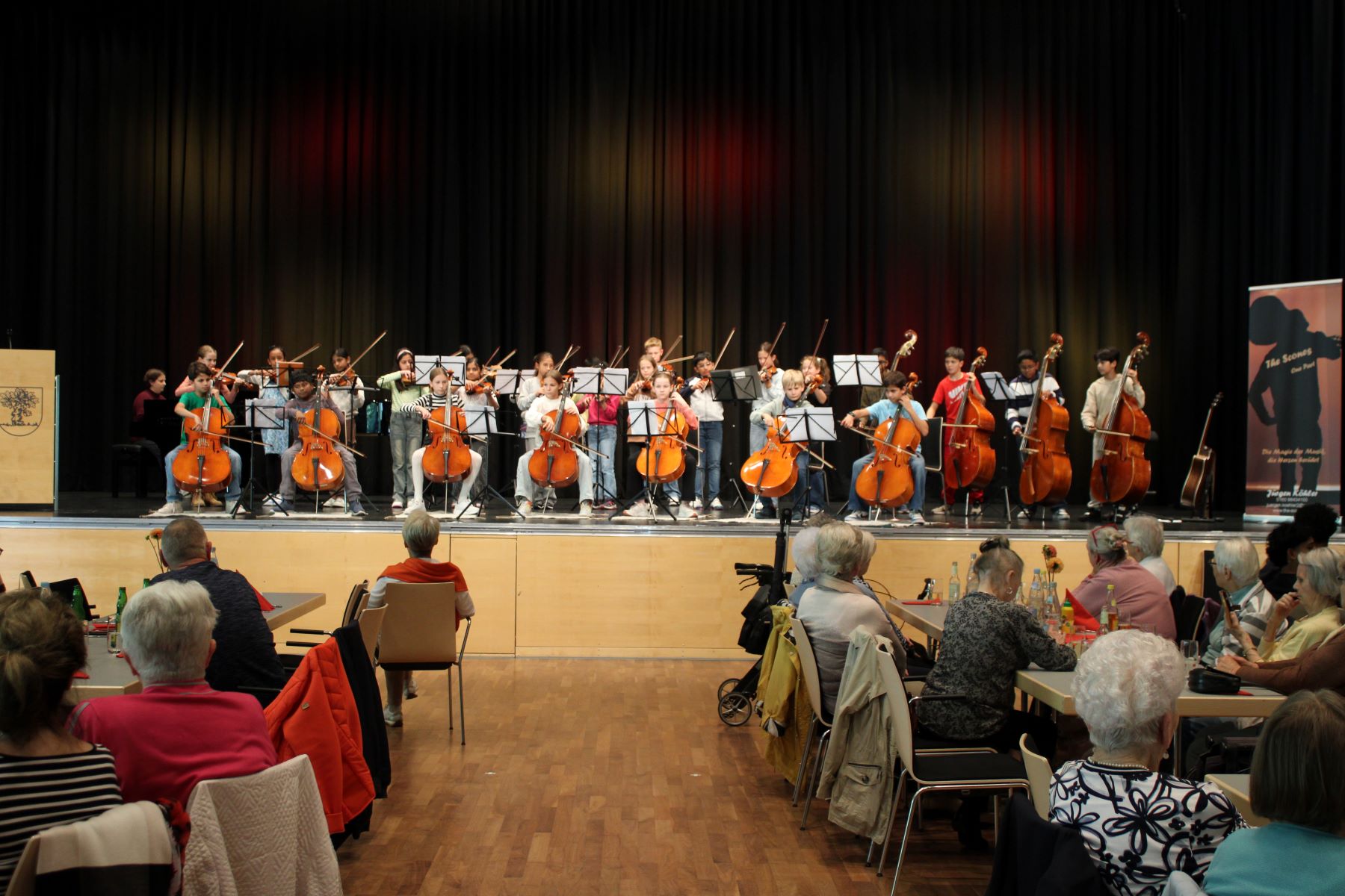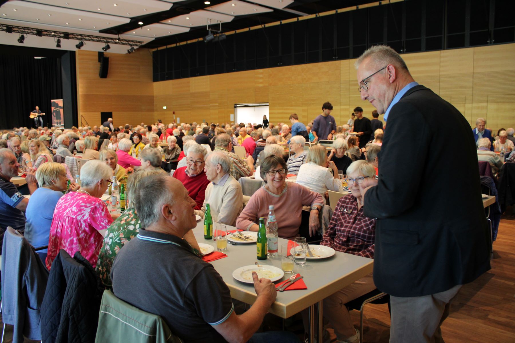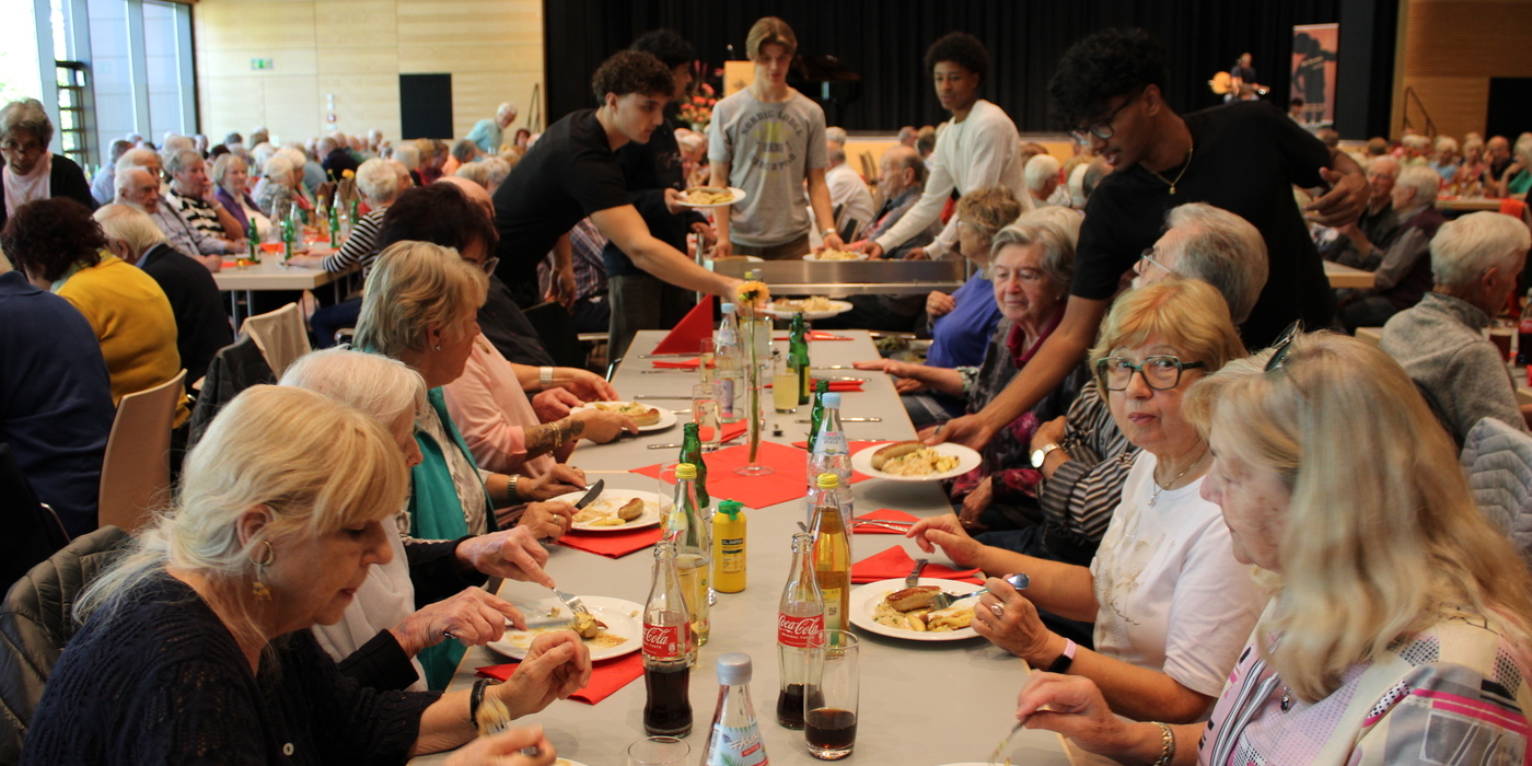 Der Dank des Bürgermeisters galt allen am Programm Mitwirkenden sowie Heike Käller und dem Fachdienst Kultur und Sport im Rathaus für die Organisation und Durchführung des Seniorentags. Matthias Renschler dankte dem Ortsverband des Deutschen Roten Kreuzes und der Freiwilligen Feuerwehr, die für die Sicherheit der Gäste vor Orte waren, aber glücklicherweise nicht tätig werden mussten. Und ein großes Dankeschön ging ebenfalls an den Küchenservice Feil, der für das Catering zuständig war, und die rund 80 Schülerinnen und Schüler aus der Kursstufe 2 des Gymnasiums, die beim Auf- und Abbau halfen und den Service während der Veranstaltung übernahmen. Dafür freuten sie sich über kleine Spenden der Seniorinnen und Senioren in ihren Kässchen am Ausgang.