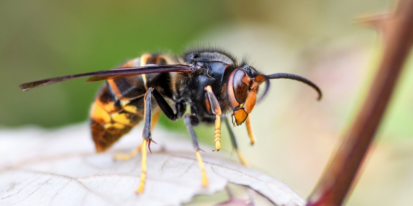 Die Asiatische Hornisse ist etwas kleiner als die heimische Hornisse und zu erkennen an den schwarz-gelb gefärbten Beinen.