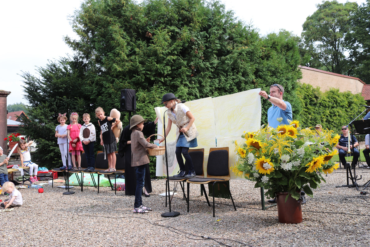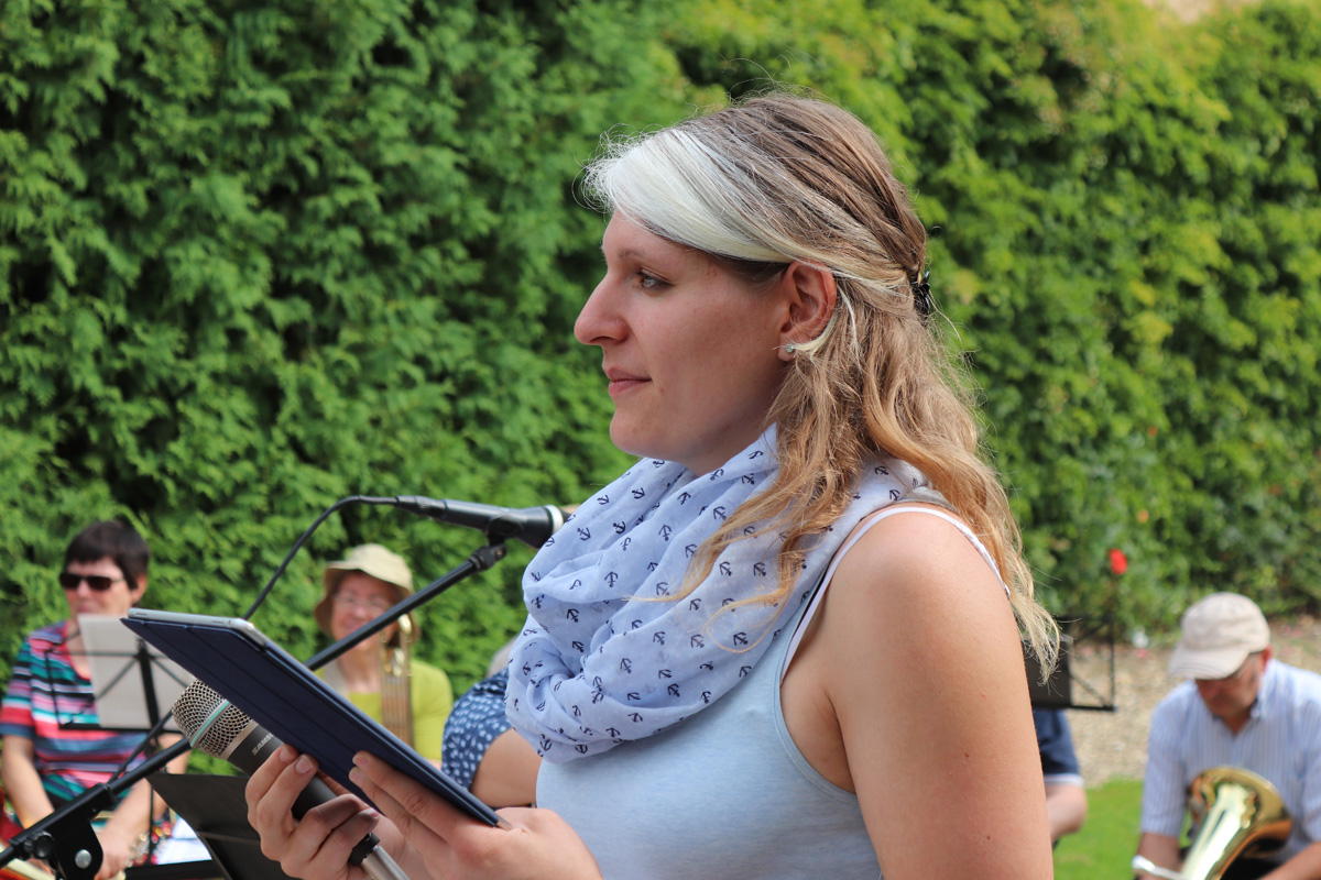 Wiesloch-Schatthausen, 22.07.2018 (rp) – Gestaltet von Pfarrerin A. Haffner, den Kindergottesdienstkindern, dem Posaunenchor und der Band Schattenspiel versammelte sich die Evangelische Kirchengemeinde Schatthausen, bei schönstem Kaiserwetter in einer wunderschönen Kulisse – dem Wasserschloss.