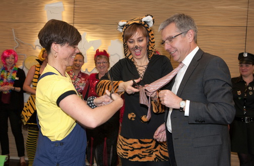 Die närrischen Frauen machten kurzen Prozess und schnitten Landrat Stefan Dallinger schnurstracks die Krawatte ab.