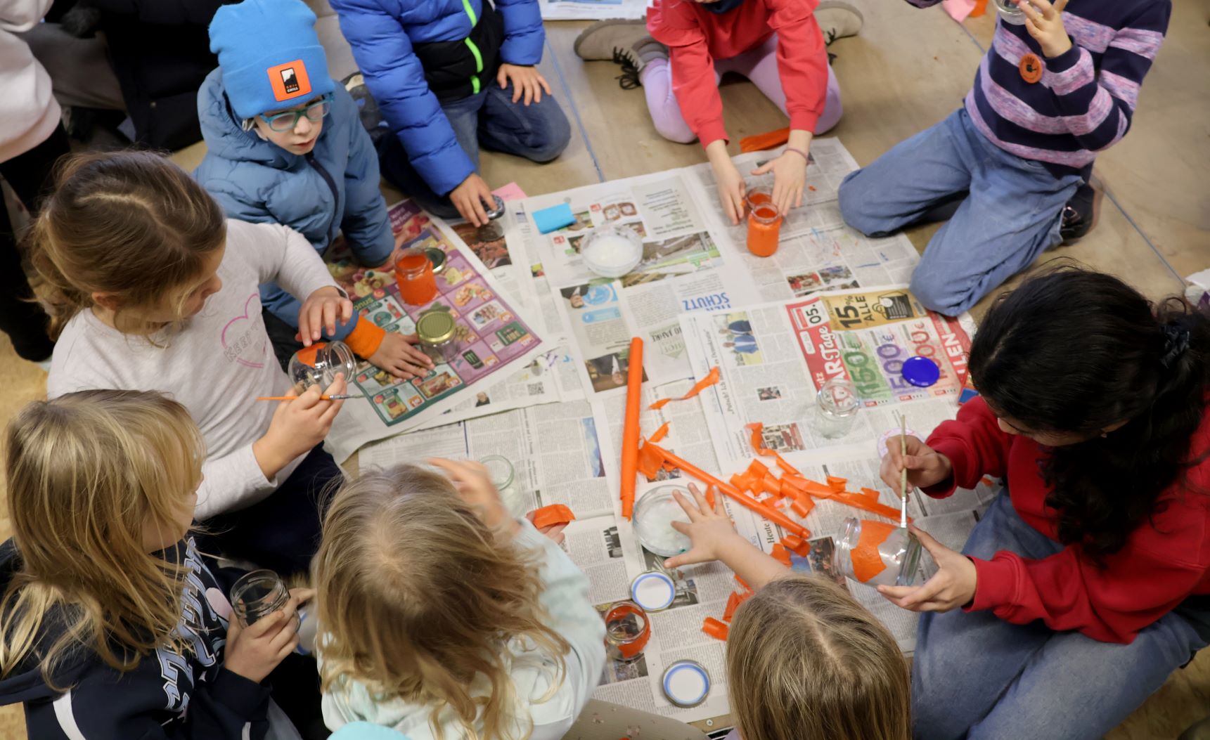 An der Waldschule gibt es ebenfalls eine Aktion zum Orange Day. „Es ist ganz toll geworden“, findet Schulsozialarbeiterin Elisa Spindler. Die SMV hat unter der Leitung von Jutta Tuscher und Jacqueline Kraft einige Mitmachangebote auf die Beine gestellt: An einer Station können Teelichter gestaltet werden, an einer anderen fertigen die Schülerinnen und Schüler Armbänder mit Perlen. Viele der Bastelutensilien sind in Orange gehalten – in Anlehnung an die Erkennungsfarbe der Aktion. Auf einer Pinnwand können die Beteiligten ihre Gedanken zum Thema „Keine Gewalt an Frauen“ zum Ausdruck bringen. „Frauen tut man nicht weh“ oder „Stoppt die ganze Gewalt gegen Mädchen“ ist dort unter anderem zu lesen. „Das Thema hat mehr Sichtbarkeit verdient“, sagt Elisa Spindler zum Hintergrund der Aktion. Denn es werde ihrer Einschätzung nach in der Gesellschaft und auch bei den Schülerinnen und Schülern zu wenig darüber gesprochen. Noch immer würden Mädchen und Frauen im Alltag mit vielen Formen der Gewalt konfrontiert: Beleidigungen und sexistische Kommentare seien an der Tagesordnung. Und sie sieht in problematischen Rollenbildern von Männern eine der Ursachen dafür. Auf einem Bildschirm ist eine informative Präsentation zu sehen.