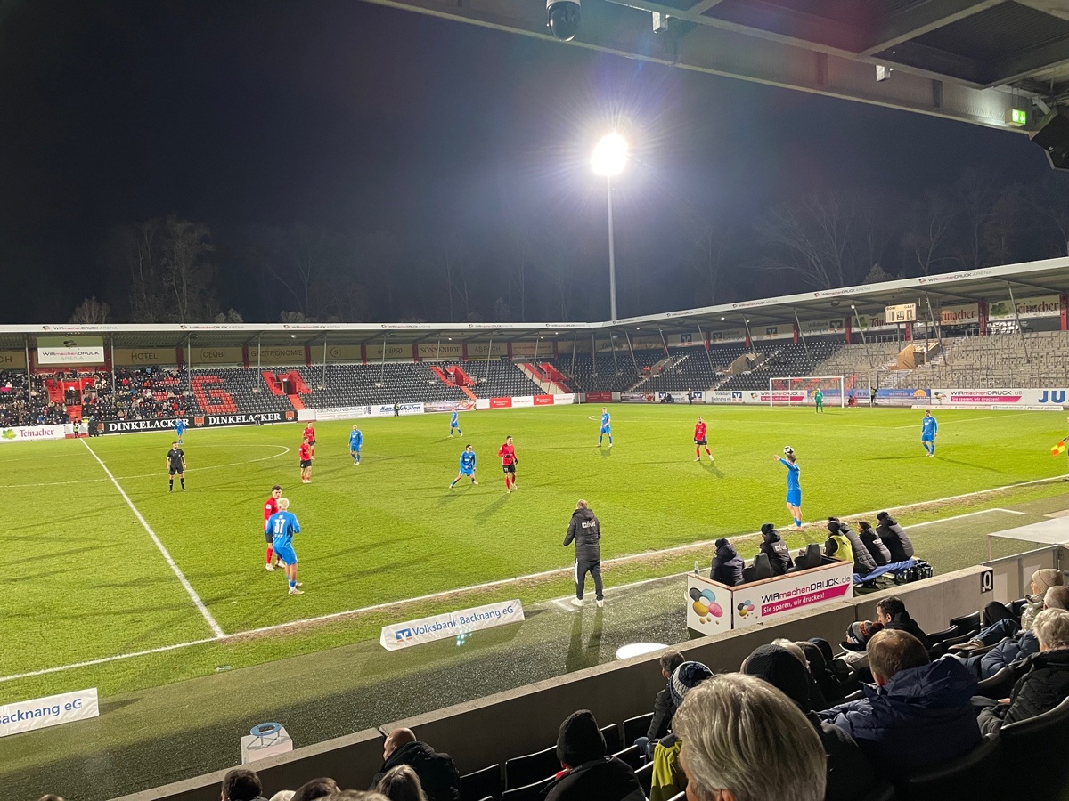 Cheftrainer Andreas Schön hatte im Vergleich zur Vorwoche einen Wechsel vorgenommen: Iosif Maroudis startete für Theo Politakis im zentralen Mittelfeld. Auf dem schmierigem Geläuf entwickelte sich zunächst ein ausgeglichenes Spiel. Die Walldorfer setzten erste Akzente – Kapitän Marcel Carl prüfte den Aspacher Torhüter Maximilian Reule in der achten Minute – doch die Führung fiel auf der anderen Seite. Loris Maier traf nach einem Zuspiel von Fabian Eisele zum 1:0 (27.). Kurz vor der Pause scheiterte Felix Kendel noch an Reule (43.).