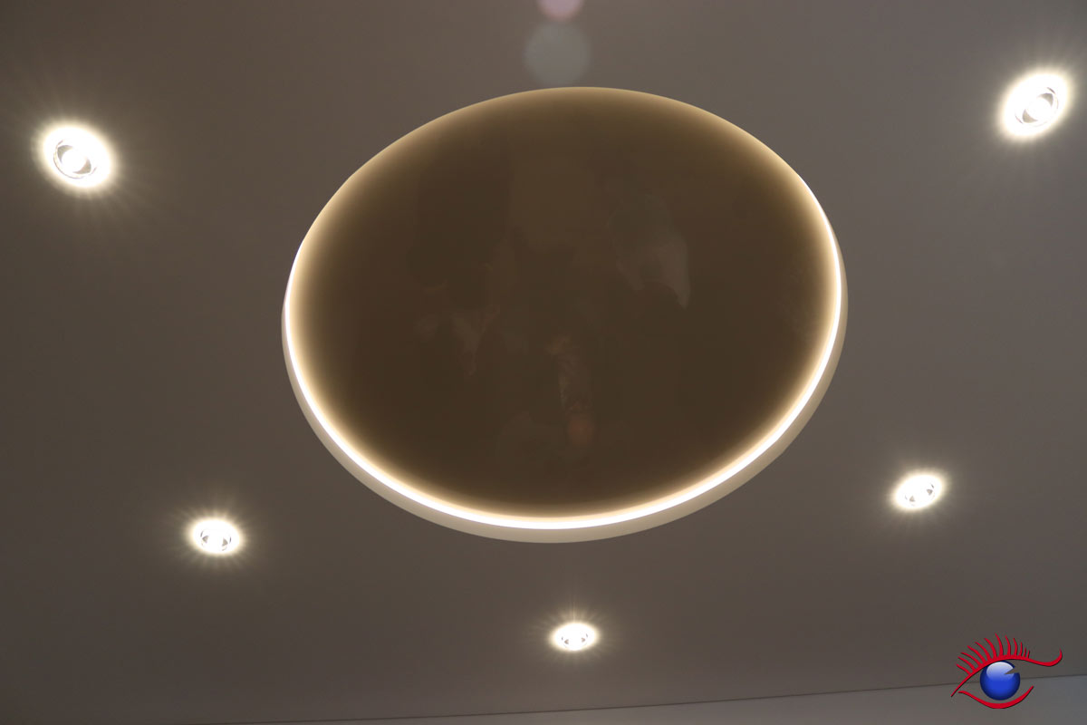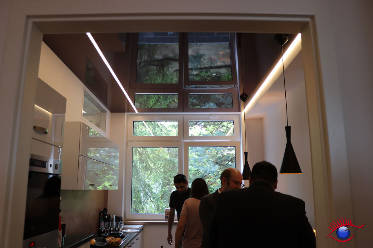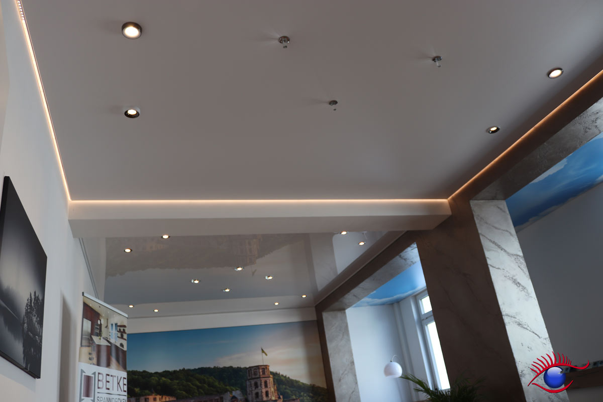 In der Ausstellung befinden sich u.a. Decken-Beispiele für Büroräume, Badezimmer, Wohn-und Essbereiche sowie die Küche.
