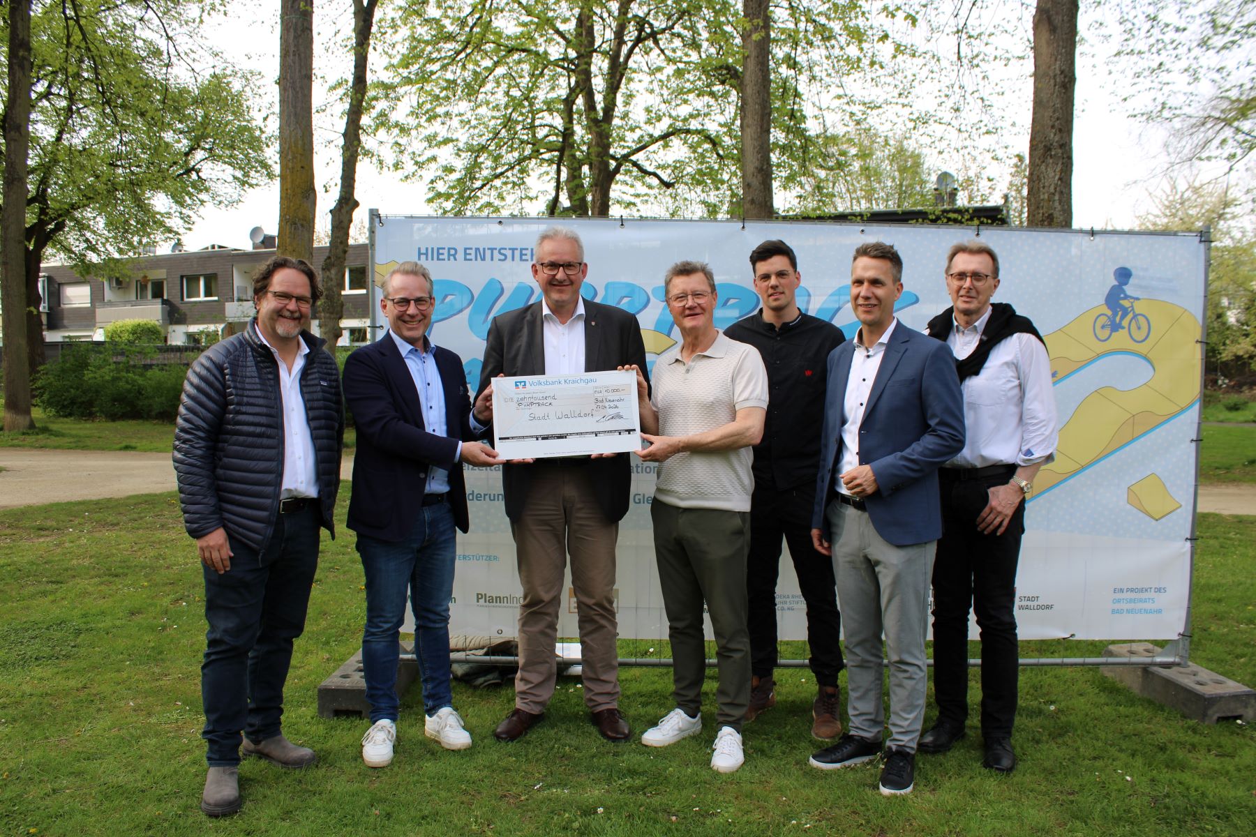 Wie vom Gemeinderat beschlossen, unterstützt die Stadt Walldorf den Bau einer Pumptrack-Anlage mit 10.000 Euro. Die Spende haben Bürgermeister Matthias Renschler und der Erste Beigeordnete Otto Steinmann im Rahmen der Klausurtagung im Beisein des gesamten Walldorfer Gemeinderats und der Verwaltungsspitze heute an Ortsvorsteher Richard Lindner, den designierten neuen Bürgermeister Pascal Rowald und das engagierte Team hinter dem Projekt übergeben.