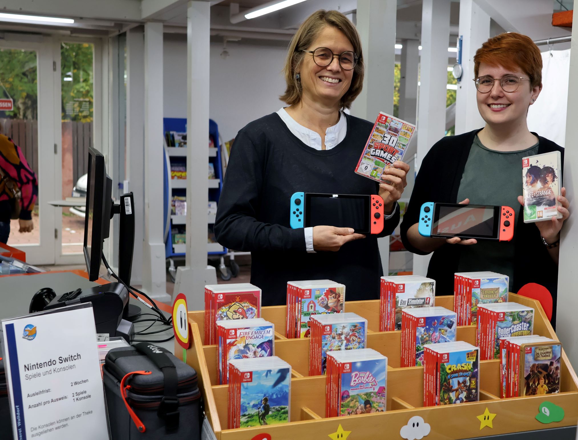 Die Switch-Konsolen können nur an Personen ab 18 Jahren ausgegeben werden, betont Barbara Grabl. Die Ausgabe der Spiele dagegen richtet sich nach der jeweiligen Altersfreigabe der USK (Unterhaltungssoftware Selbstkontrolle). „Wir haben nur Spiele im Sortiment, die maximal bis zwölf Jahre freigegeben sind“, ergänzt Franziska Kau, stellvertretende Leiterin der Stadtbücherei. Die Spiele seien aber sicher auch für Erwachsene interessant.