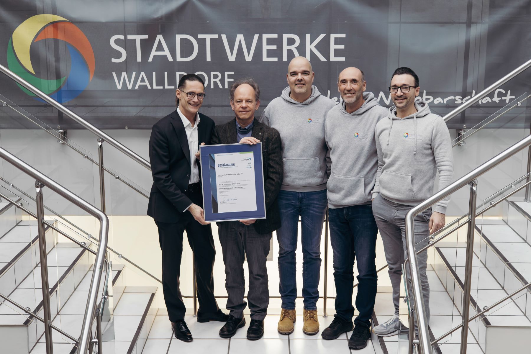 Die offizielle Übergabe der Bestätigungsurkunde fand am Mittwoch, 4. Februar, bei den Stadtwerken Walldorf statt. Persönlich überreicht wurde sie von Thomas Anders, Geschäftsführer der DVGW-Landesgruppe Baden-Württemberg. Neben der Geschäftsführung nahmen auch die verantwortlichen Mitarbeiterinnen und Mitarbeiter sowie die beteiligten Fachabteilungen teil.