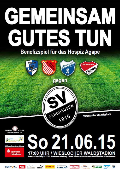 Nach dem Klassenerhalt in der 2. Bundesliga richtet der SV Sandhausen bereits seinen Fokus auf die vierte Zweitligasaison. Im Rahmen der Vorbereitungen bestreitet das Team von Alois Schwarz am 21.06.2015 ein Benefizspiel zu Gunsten des Hospiz Agape um 17.00 Uhr im Waldstadion Wiesloch