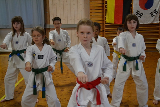 Gymnastik und Selbstverteidigungsübungen. sind ebenso Bestandteil wie Formenschule, Sparring, und Sprungtechniken.