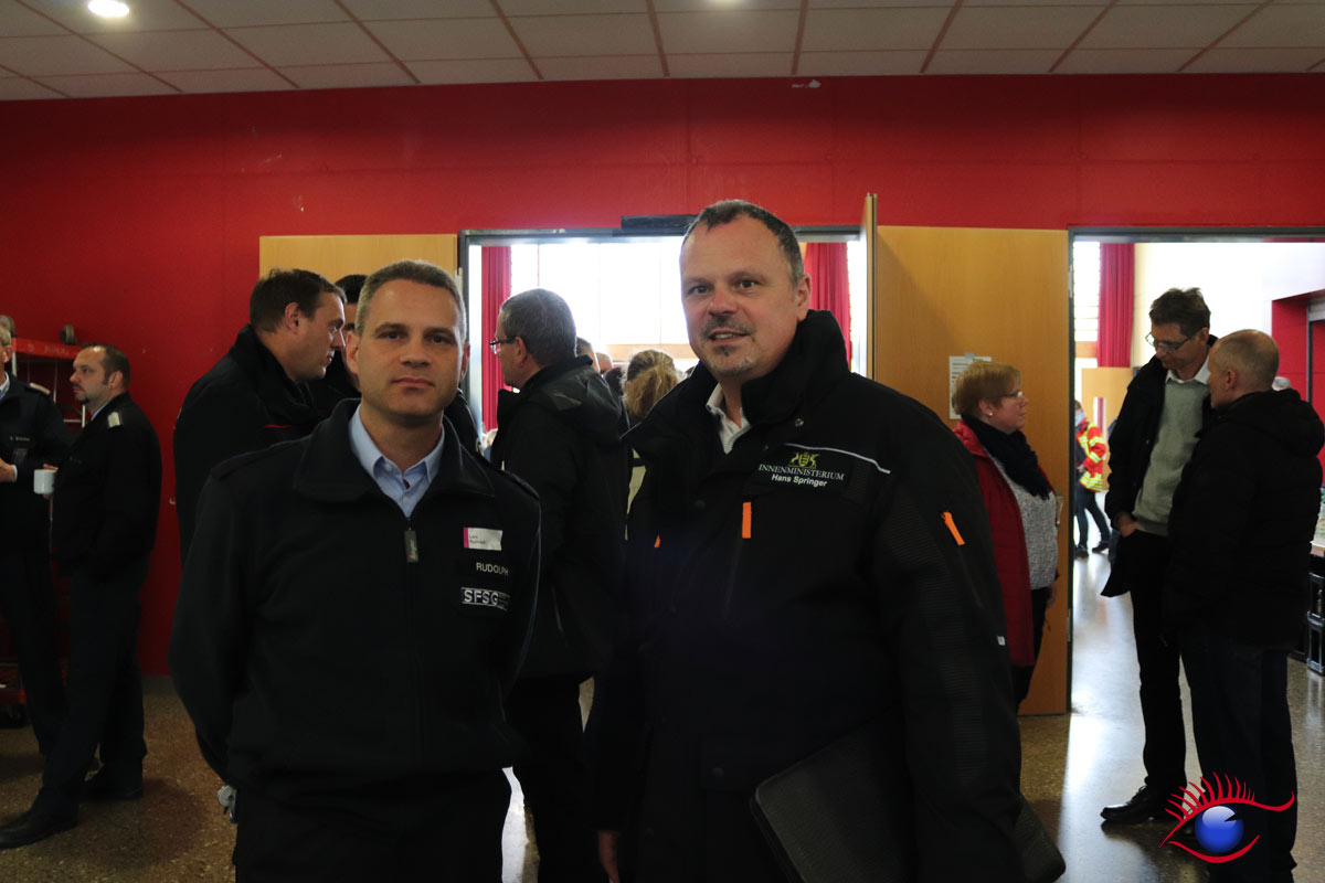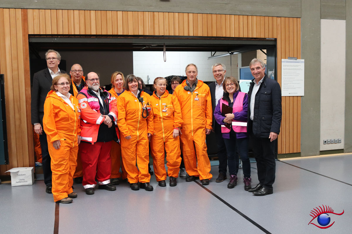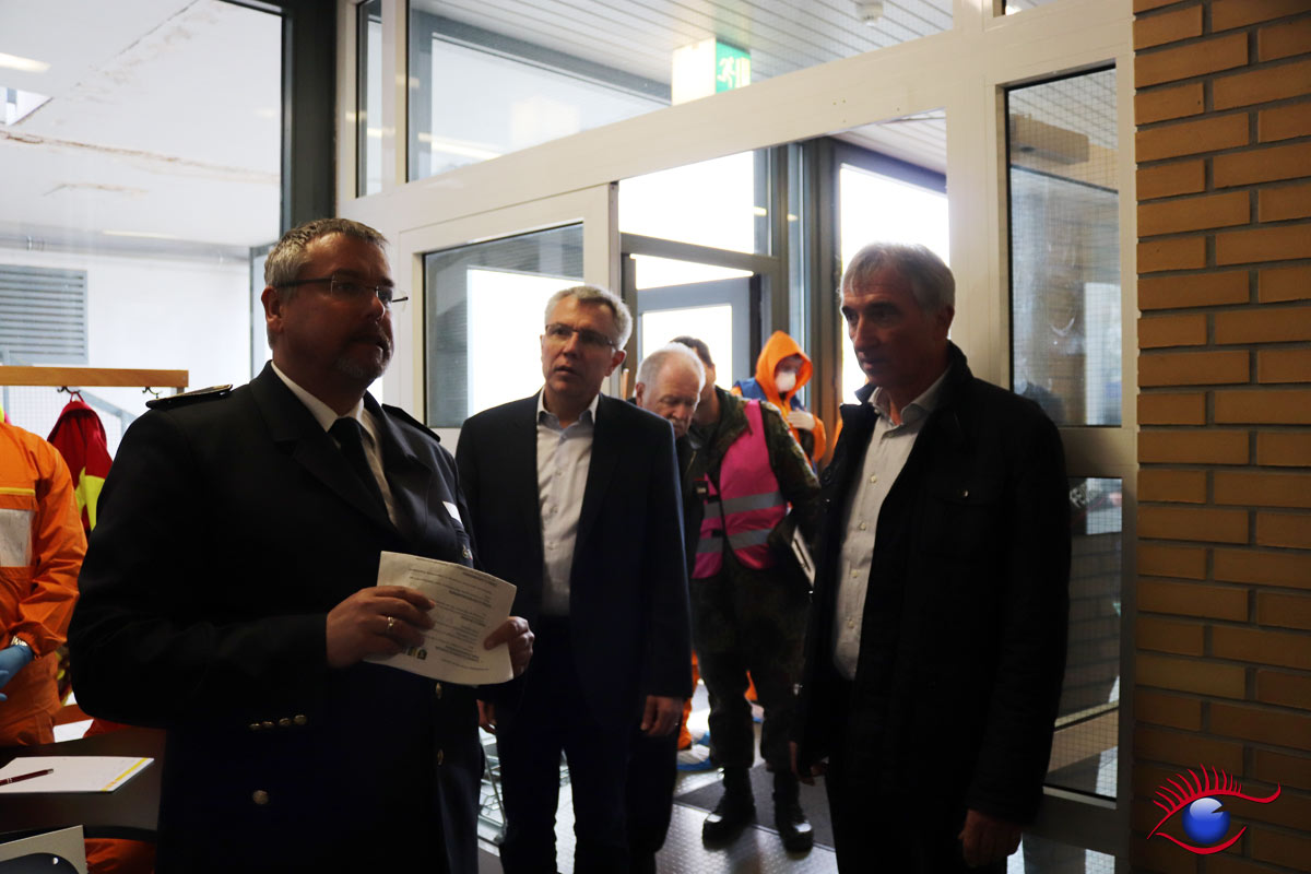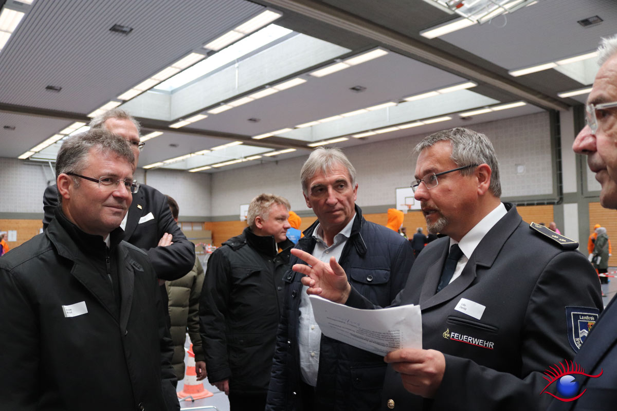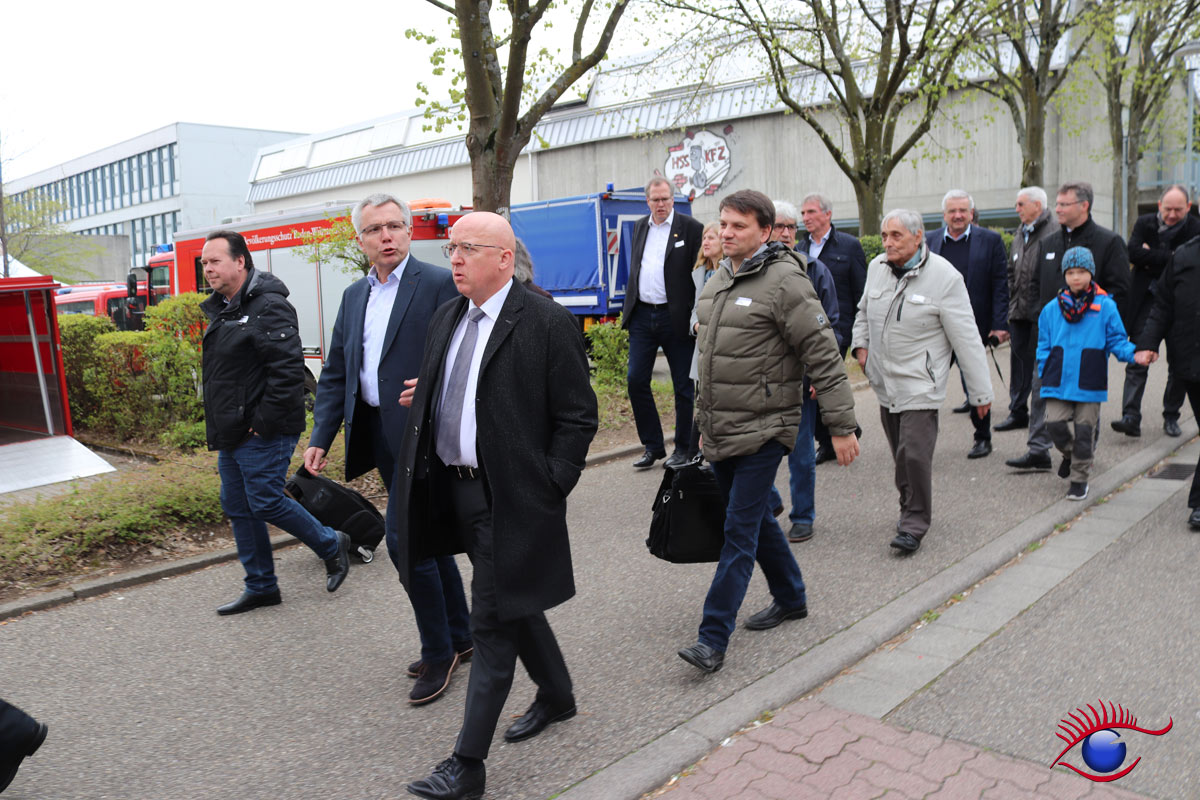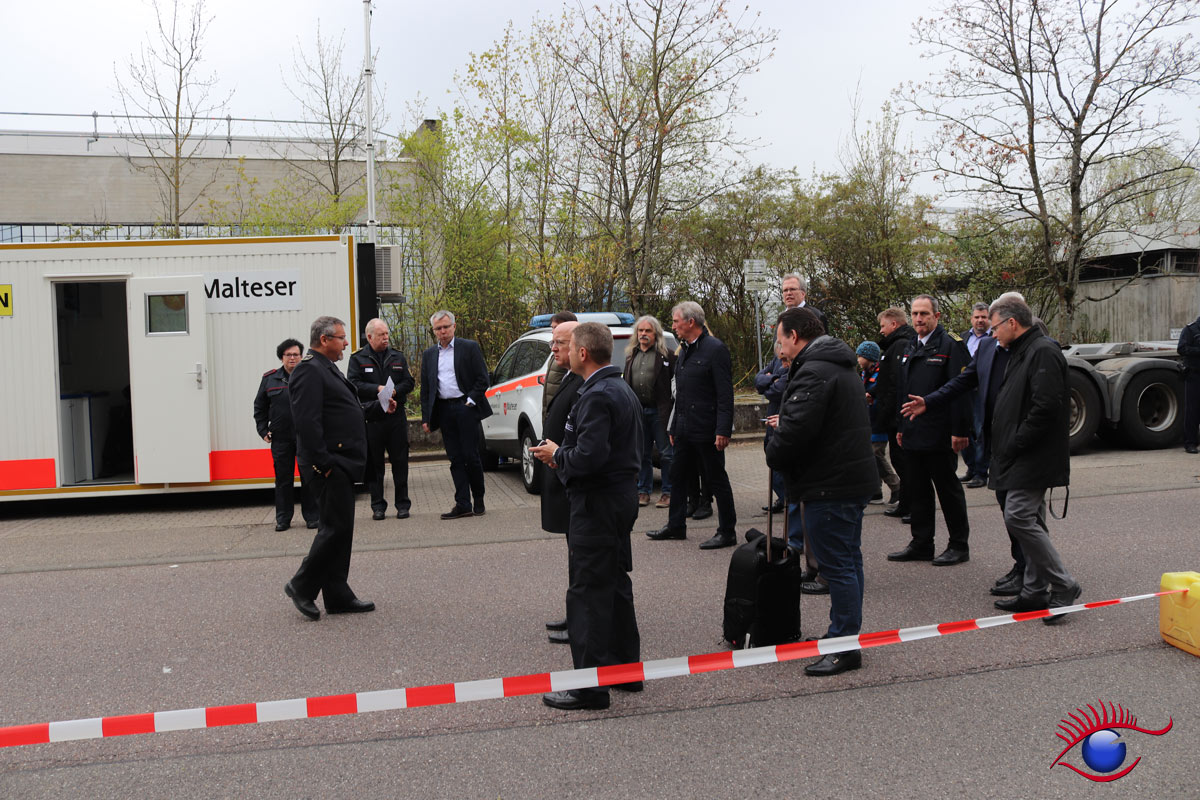 Landrat des Rhein-Neckar-Kreis Stefan Dallinger führte Landtagsabgeordneter Karl Klein und weitere Gäste durch die Teilstationen. „Die Helfer leisten ganze Arbeit“ lobte Karl Klein die Einsatzkräfte. Unter anderem waren auch Gäste aus der Schweiz anwesend die die Übung mit großem Interesse beobachteten. Wieslochs Bürgermeister Ludwig Sauer war ebenfalls anwesend.