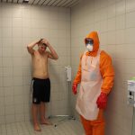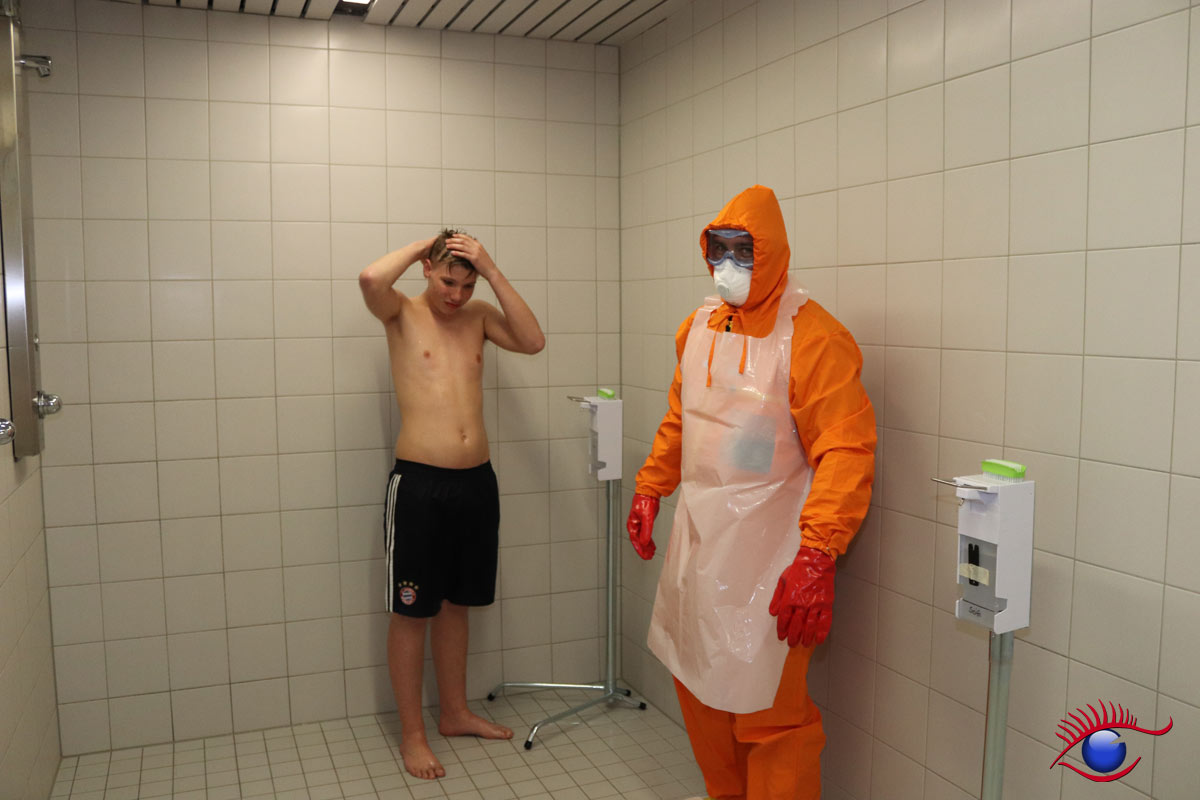 Ganzkörperdekontamination (Duschen mit viel Seife oder Shampoo) nur bei vordringlich zu dekontaminierenden Personen (Kontamination > 40 kBq/cm²), dabei soll möglichst kein Wasser in Augen, Nase oder Mund gelangen (Vermeidung der Inkorporation).