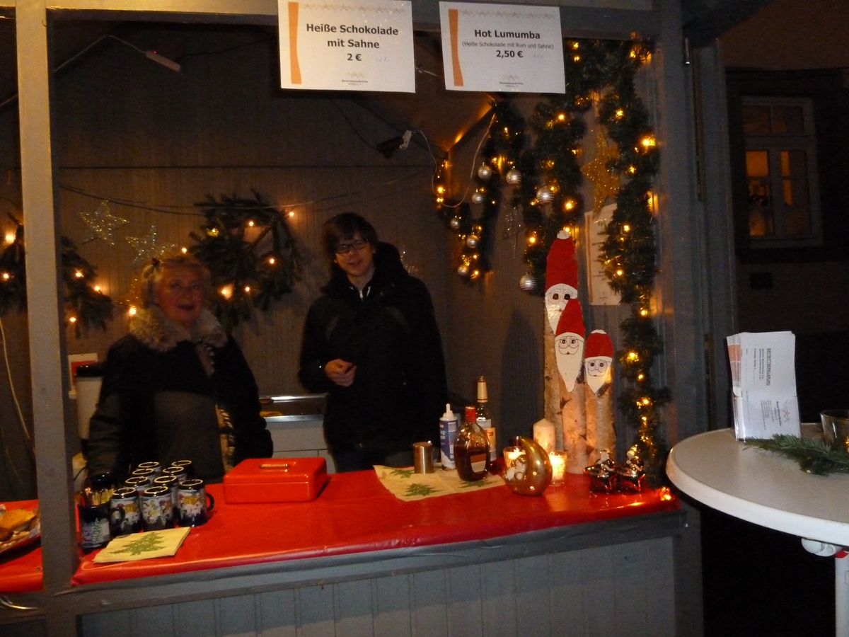 (bb) Zum Bummeln und Genießen ließen sich viele Besucher Zeit, um die Angebote der Vereine zu nutzen. Für die musikalische Unterhaltung sorgten am Samstagabend das Duo Piano & Gesang mit Christoph Engelsberger & Ute Berlinghof sowie der Walldorfer Gospelchor. Am Sonntag spielte der Posaunenchor Weihnachtslieder; an beiden Tagen war Annemarie Gröner als Märchenerzählerin im Pavillon und viele Kinder lauschten gespannt ihren Geschichten. Das DRK, die DLRG, der Schützenverein, Anpfiff ins Leben, EGJ/KJG und viele mehr sorgten mit Glühwein, heißem „Hugo“, Würstchen, Crepés, Flammkuchen und anderen leckeren Sachen für die gute Bewirtung ihrer Gäste. Gymnasium und Realschule waren ebenso vertreten wie die „Generationenbrücke“, die Heiße Schokolade mit und ohne Schuss anbot.