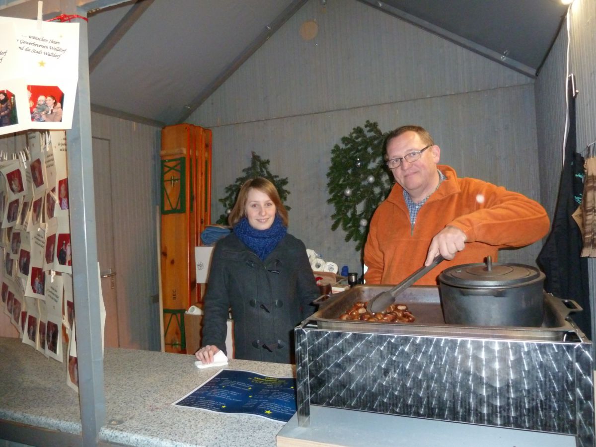 Neben der Märchenbühne am Pavillon heizte der Gewerbeverein mit heißen Maronen ein, und dort war auch Bernhard Gröner als Leiter der Unterabteilung Werbegemeinschaft des Gewerbevereins zusammen mit Mitarbeitern der Stadt Walldorf für die Aussteller und Besucher die Anlaufstelle für eventuell auftretende Probleme aller Art. Der Weihnachtsmarkt hat nun Pause bis zum nächsten Jahr, aber die beiden wunderschönen beleuchteten Weihnachtsbäume auf dem Marktplatz und der Drehscheibe werden noch einige Wochen leuchten.