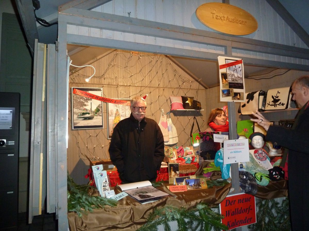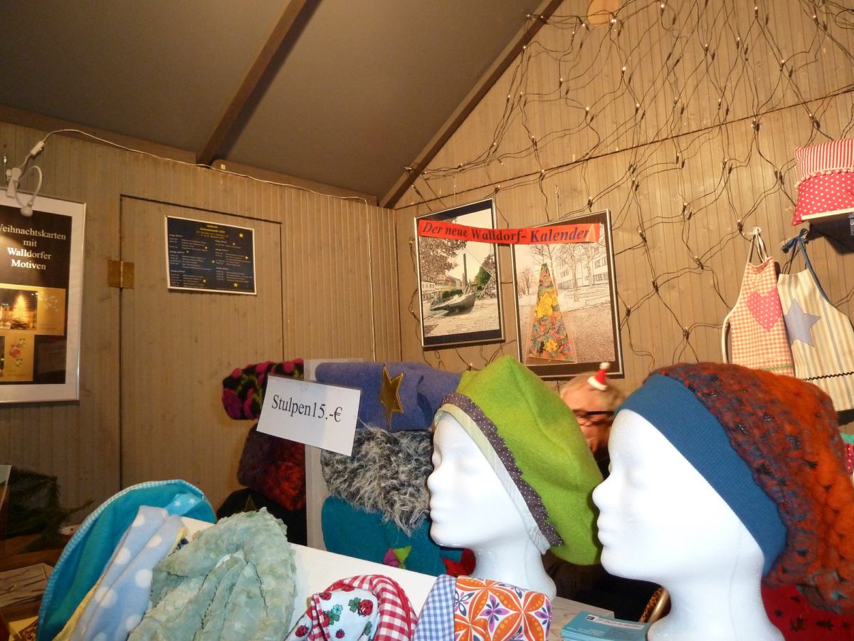 Am Stand von „TextAuslöser“ und „Fachwerk“ gab es warme Mützen und Stulpen sowie den von Kerstin von Splenyi gestalteten Walldorf-Kalender 2014 zu kaufen. Der „Kreativkreis“ bot seine Handarbeiten (Weihnachtsschmuck, Socken, lustige Tierkissen) an.
