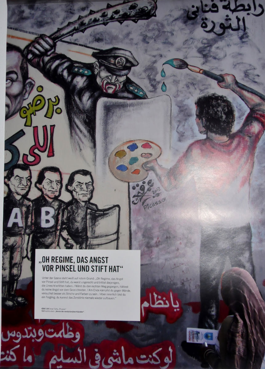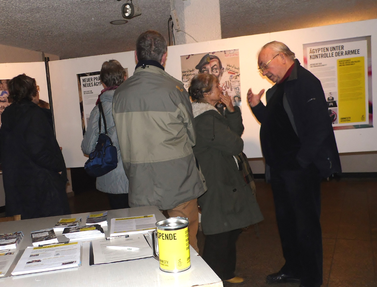 Die Bilder der Ausstellung symbolisieren einige darstellerische Äusserungen von Menschen, die etwas anprangern und damit auch ihr Anliegen bekannt machen wollen. Doris Eckel-Weingärtner unterstrich die Ausführungen und wies darüber hinaus auf weitere Angebote der EEB in den nächsten Wochen zum Thema Ägypten (http://www.eeb-rhein-neckar-sued.de/programm) .