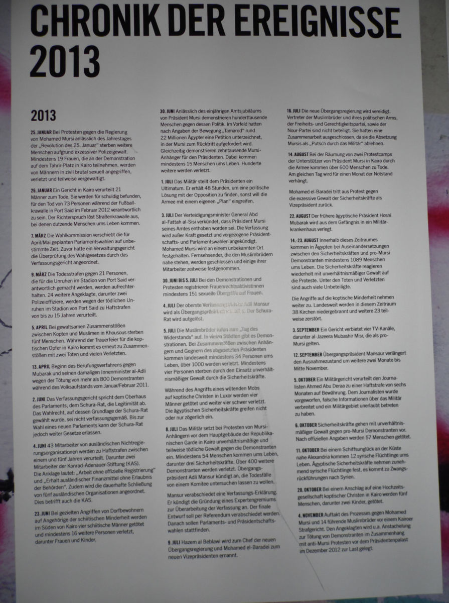 Familien, der u.a. der Sohn von des ehemaligen Präsidenten Mubarak angehört, die durch die wirtschaftliche Unterwanderung der Regierung dem Land extrem schaden. Eine weitere bis zur Absetzung von Mursi am 03. Juli d. J. einflussreiche Gruppierung sind die Moslem Brüder. Denen entstammt der schwache Präsident Mursi, der in seiner Regierungszeit keinerlei Verbesserungen für das Volk auf den Weg gebracht hat. Nach dem 03.07. wurde Mursi inhaftiert und sowohl er wie auch führende Moslem-Brüder angeklagt. Einer aus dieser Gruppierung wurde undemokratisch zum Chef des Sicherheitsdienstes gemacht – eine weitere Schwächung des Demokratie – Prozesses. Mursi vertraute den Falschen und bekämpfte die Falschen. Aktuell hat zwar der Prozess gegen Mubarak begonnen und der gegen Mursi und die Führer der Moslem Brüder sollte am 09. Dezember beginnen.