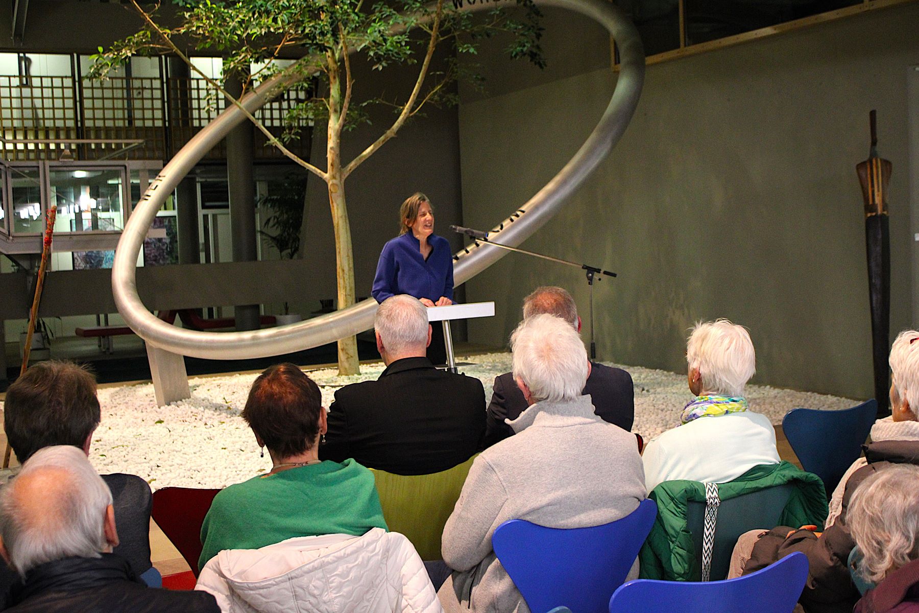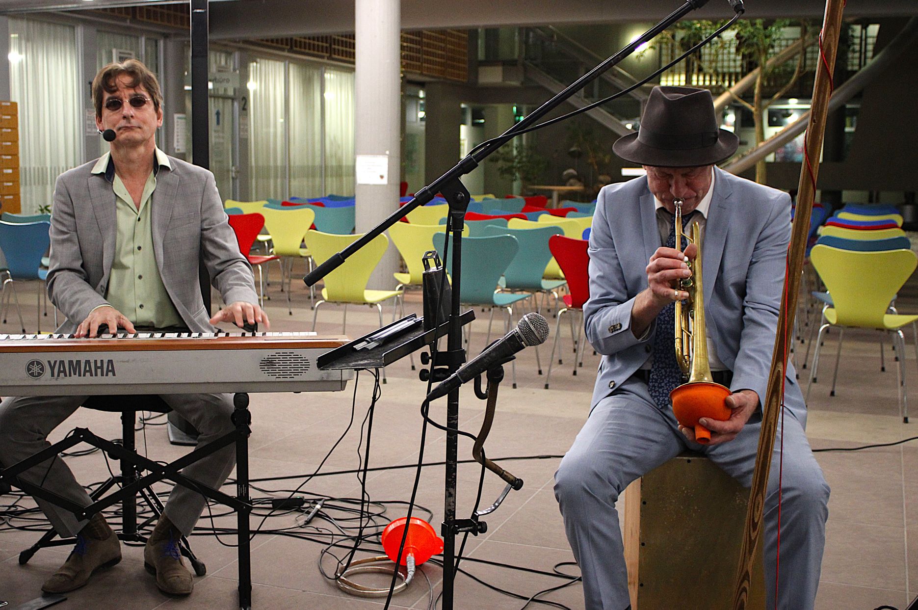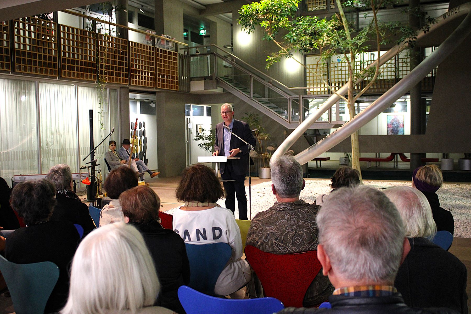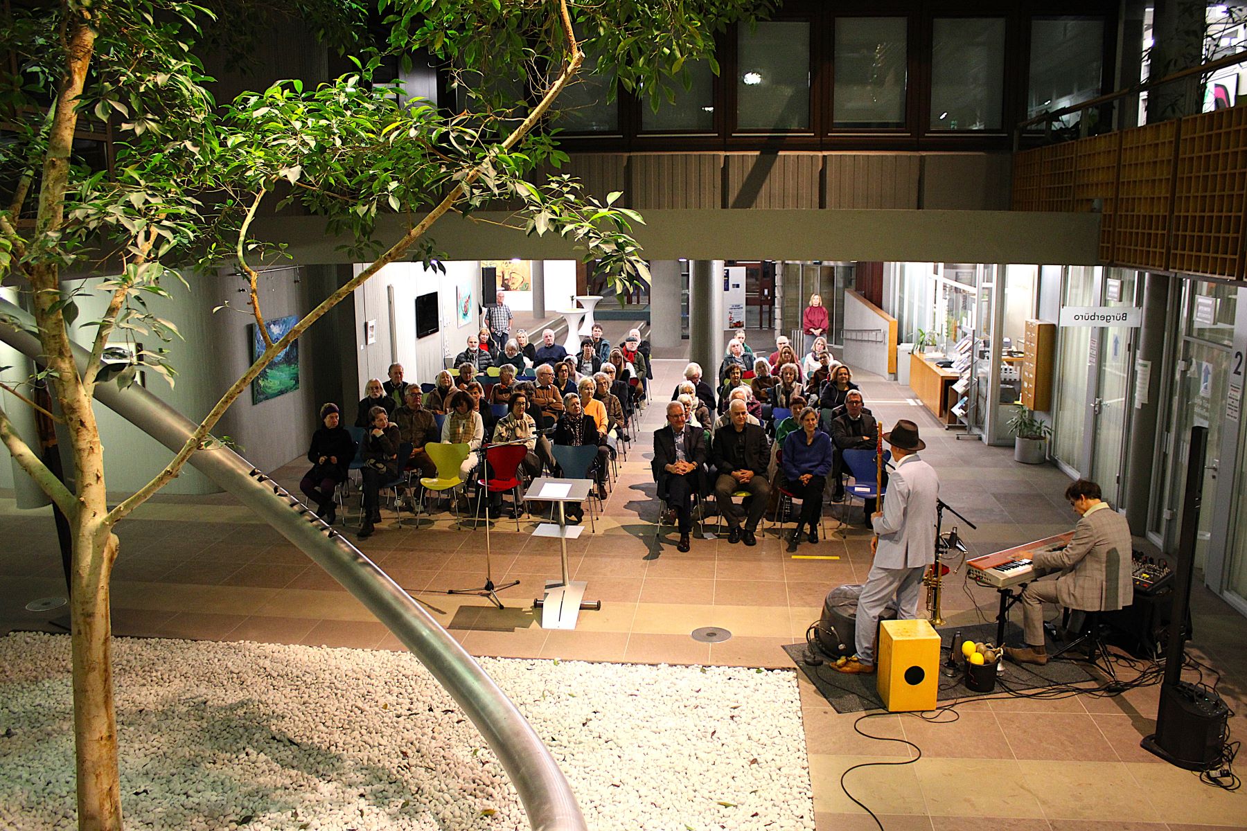 Der Dank des Bürgermeisters gilt der Kunstbeauftragten sowie dem Fachdienst Kultur und Sport für die Organisation der Ausstellung. Kristina Hoge bedankt sich bei Bürgermeister Renschler, dem Ersten Beigeordneten Otto Steinmann und Heike Käller für die Unterstützung und dafür, dass sie in Walldorf gut aufgenommen worden ist. „Ich freue mich auf viele weitere Ausstellungen hier“, sagt sie. Musikalisch umrahmt wird die Vernissage vom Huub Dutch Duo aus Heidelberg, das auch mit origineller Instrumentierung und Wortwitz zu unterhalten weiß. Bei einem kleinen Umtrunk bietet sich den erfreulich zahlreichen Besucherinnen und Besuchern die Gelegenheit, sich über die Kunstwerke auszutauschen.