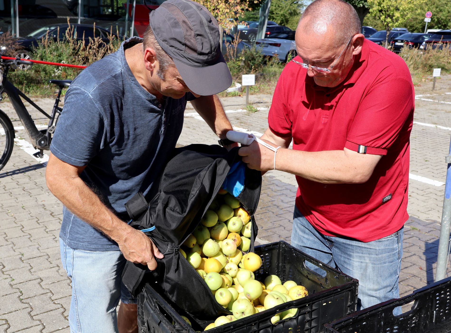 Das tat auch Carsten Voges, der am Nachmittag seine zweite Fuhre mit dem Fahrrad zur Apfelpresse brachte. Die Äpfel hatte er von zwei Bäumen auf der Streuobstwiese bei der SAP geerntet. Für die Apfelpresse kam er allerdings etwas zu spät: Sie war aufgrund der geringen Resonanz schon etwas früher abgebaut worden. „Die Äpfel gehen an den Tierpark“, hatte Bernd Gröner jedoch trotzdem eine sinnvolle Verwendung für die Ernte von Carsten Voges. Dieser durfte sich – wie die anderen fleißigen Erntehelfer – einen Karton frisch gepressten Apfelsaft mit nach Hause nehmen.
