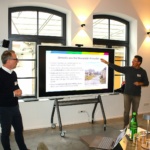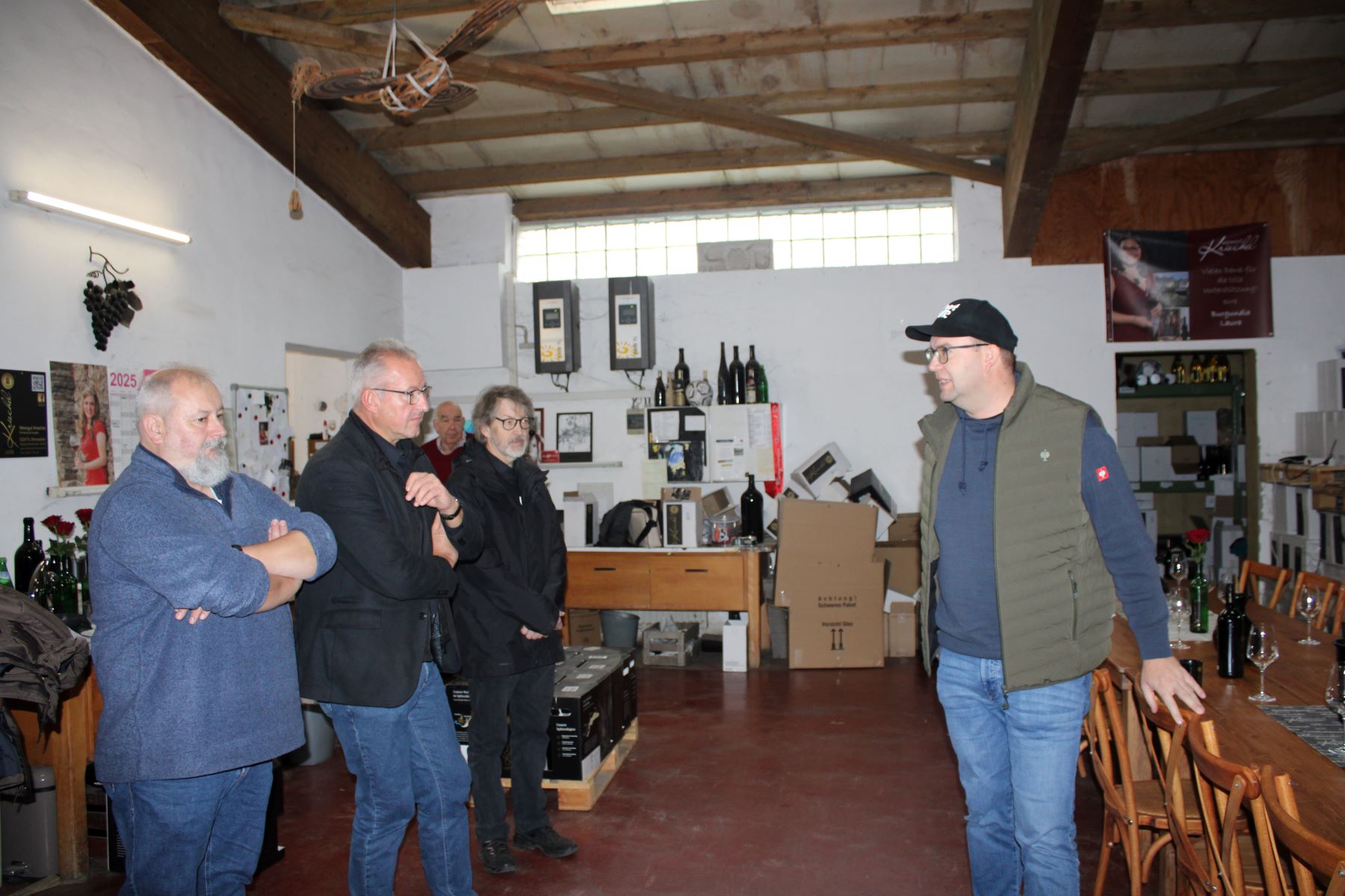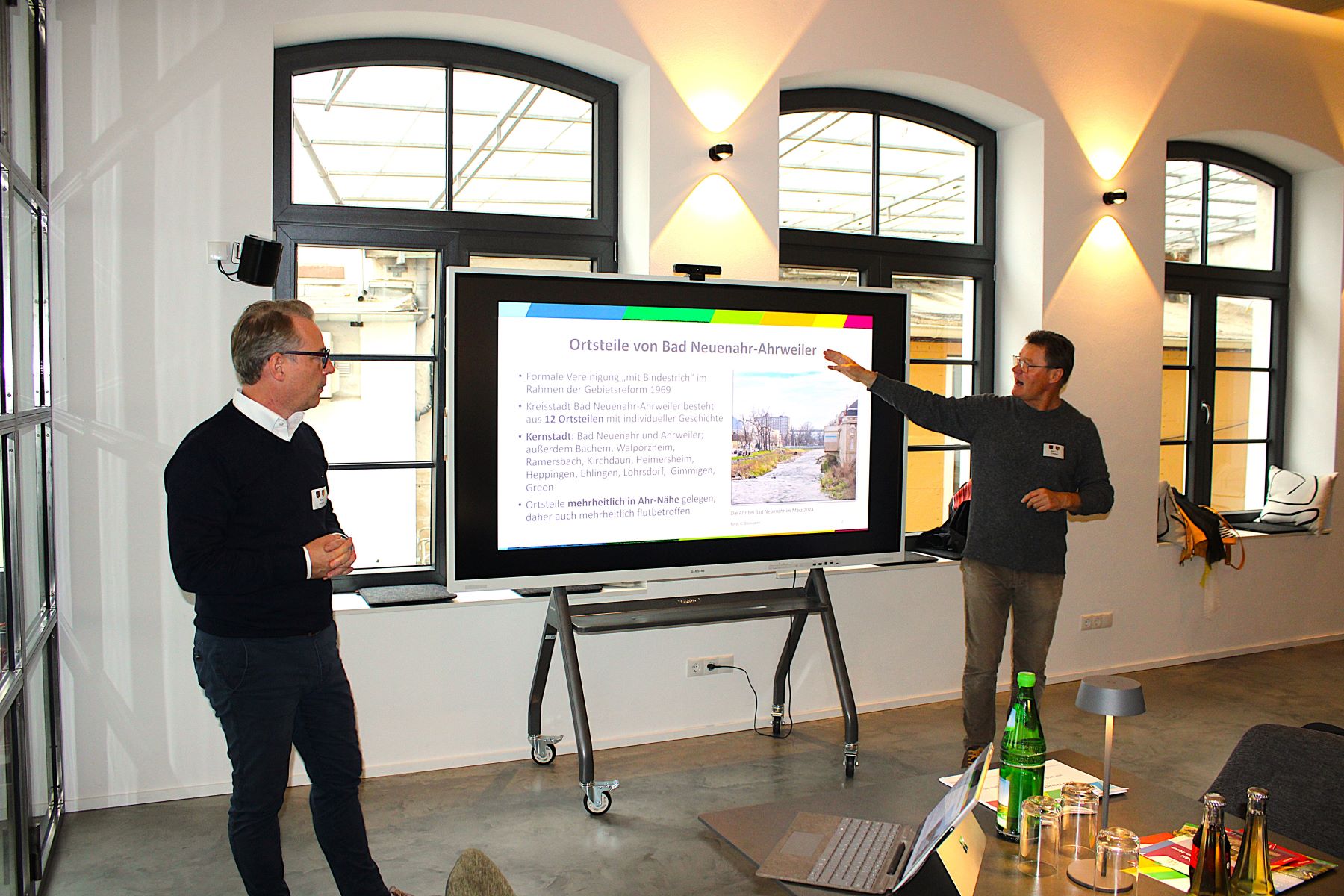 David Bongart stellt den Besuchern aus Walldorf die Ziele und Projekte des Vereins Zukunftsregion Ahr vor, der sich um die Zukunftsfähigkeit im gesamten Landkreis Ahrweiler kümmern möchte. Dazu gehören unter anderem die Etablierung eines Fachkräftezentrums, eine geplante Flut-Dokumentationsstätte oder ein Arbeitskreis, der sich mit innovativen Projekten auf dem Feld der erneuerbaren Energien beschäftigt.