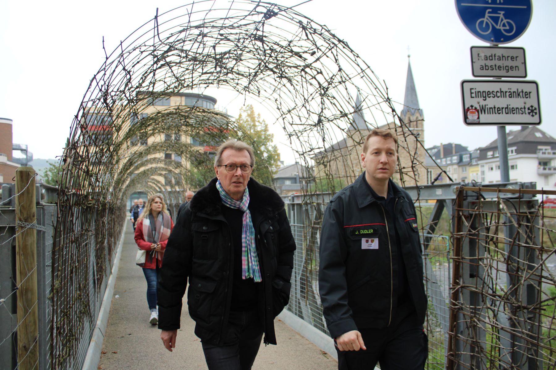 „Wir haben viel, viel mitgenommen“, sagt Bürgermeister Matthias Renschler, als er sich bei Richard Lindner, dem Ortsvorsteher von Bad Neuenahr, für zwei spannende Tage mit vielen neuen Eindrücken bedankt. Manche schön, andere ergreifend, einige bedrückend. Das passt zur Situation im Ahrtal, in dem auch mehr als vier Jahre nach der Flutkatastrophe vom Juli 2021 die Gegensätze dominieren: hier der frisch sanierte Straßenzug, dort der Schuttabladeplatz. Neu gebaute Häuser stehen neben Ruinen, in denen seit der Flut nichts geschehen ist und vielleicht auch nichts mehr geschehen wird. Bagger und Kräne gehören wie selbstverständlich zum Stadtbild, der Wiederaufbau läuft und ist weit davon entfernt, abgeschlossen zu sein. Gerade ist der rheinland-pfälzische Innenminister Michael Ebling vor Ort, um Peter Diewald, dem Ersten Beigeordneten der Stadt Bad Neuenahr-Ahrweiler, einige Förderbescheide des Landes zu überreichen. Beide danken den Besuchern aus Walldorf für die Unterstützung in den vergangenen Jahren.