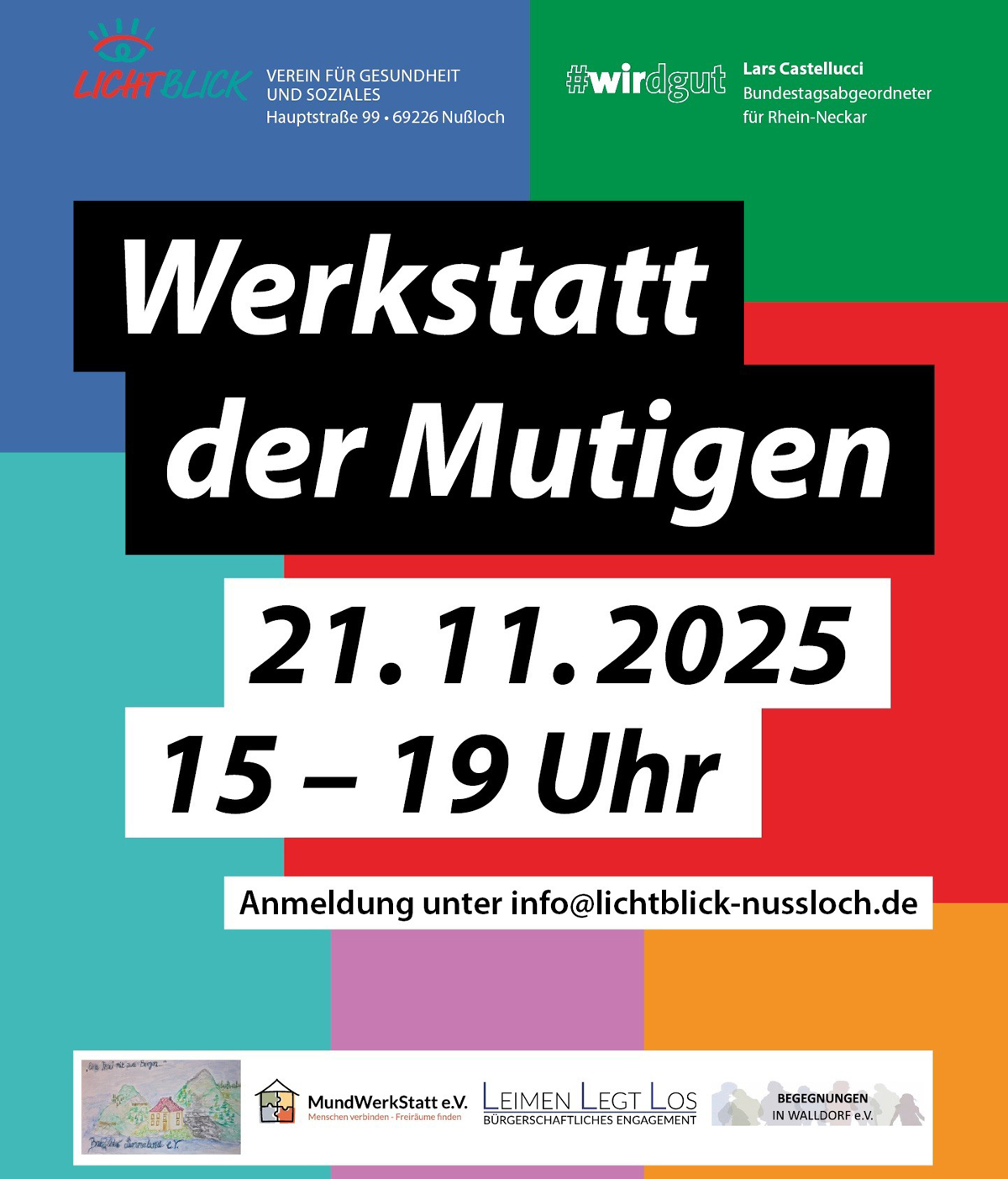 Organisiert wird die Veranstaltung von Lichtblick e.V., der seit vielen Jahren vielfältiges Engagement in Nußloch bündelt – vom „Wohnzimmer Nebenan“ bis zur Schreibwerkstatt und Beratungsangeboten. Die Werkstatt soll diese Arbeit stärken, sichtbar machen und enger mit politischen Entscheidungsträger:innen verknüpfen. Die Veranstaltung findet am Freitag, 21. November, ab 15 Uhr statt; eine Anmeldung ist unter www.tiny.cc/Werkstattdermutigenoder per Mail an [email protected].
