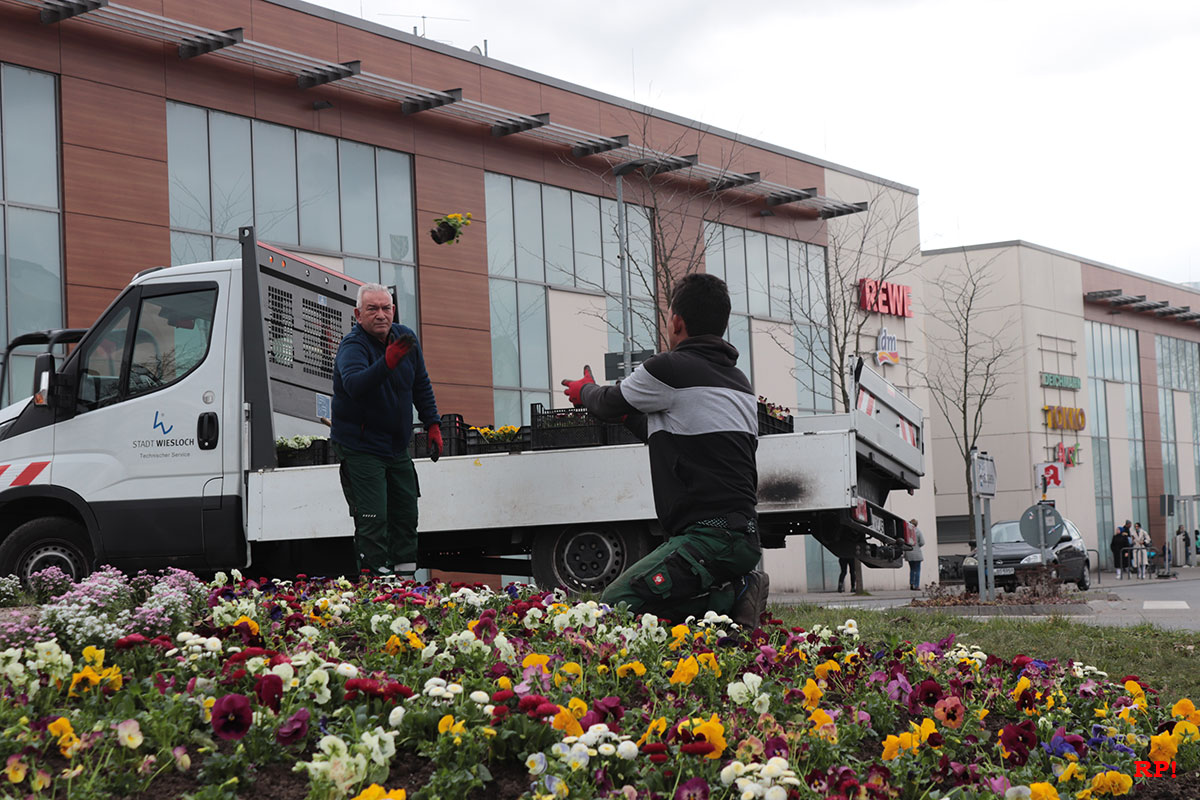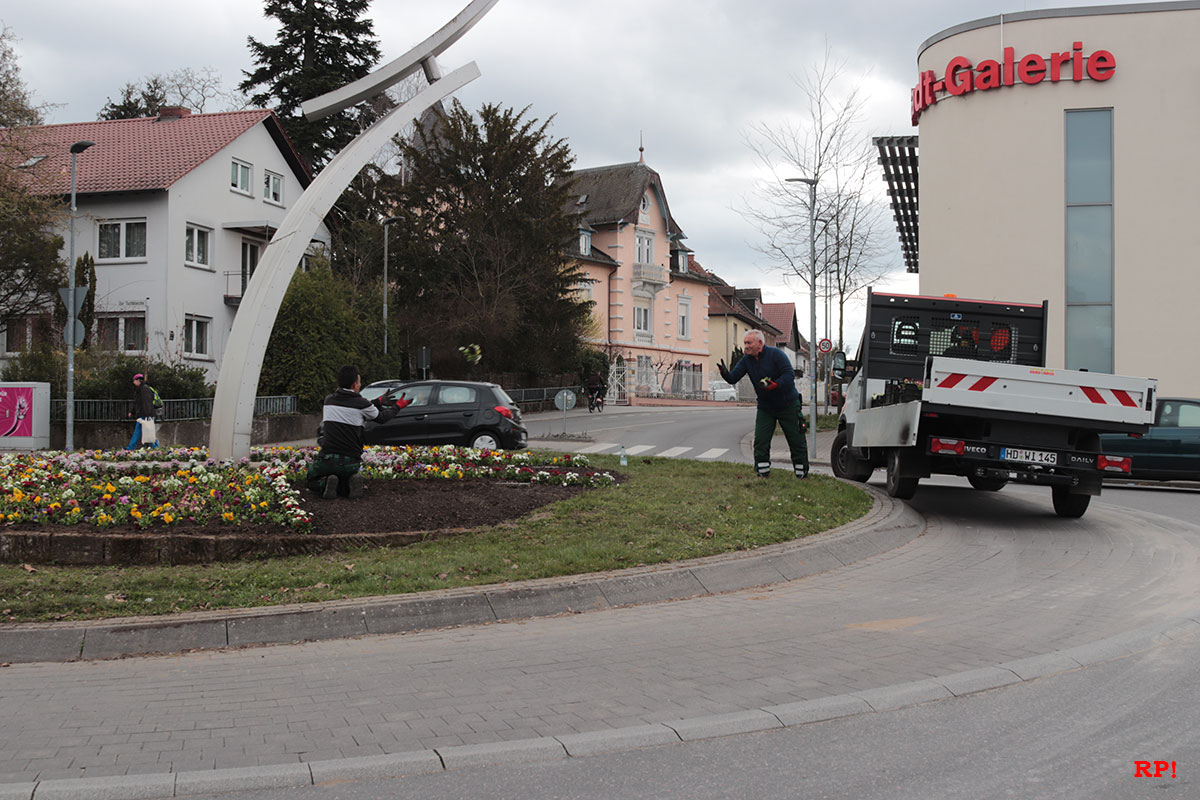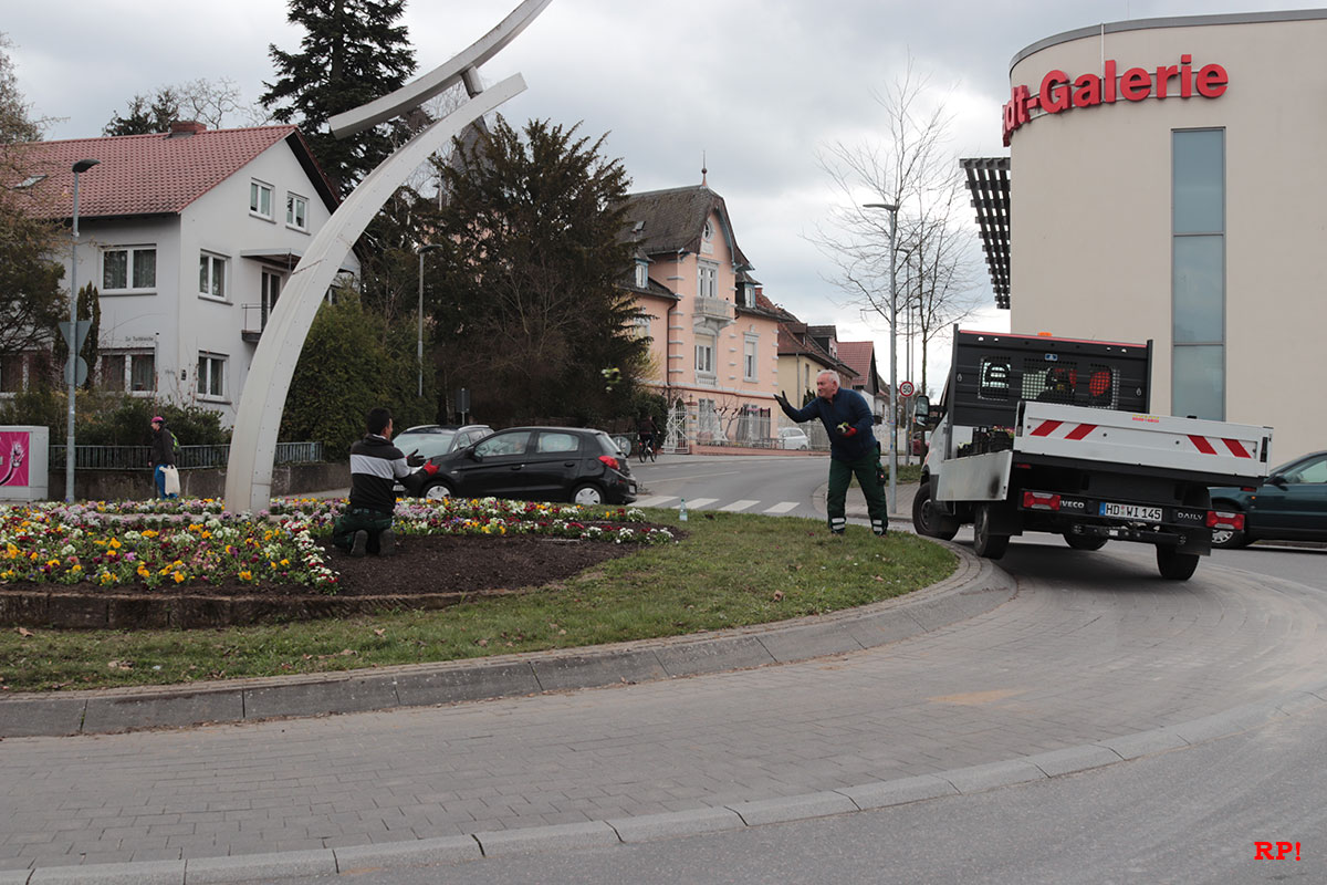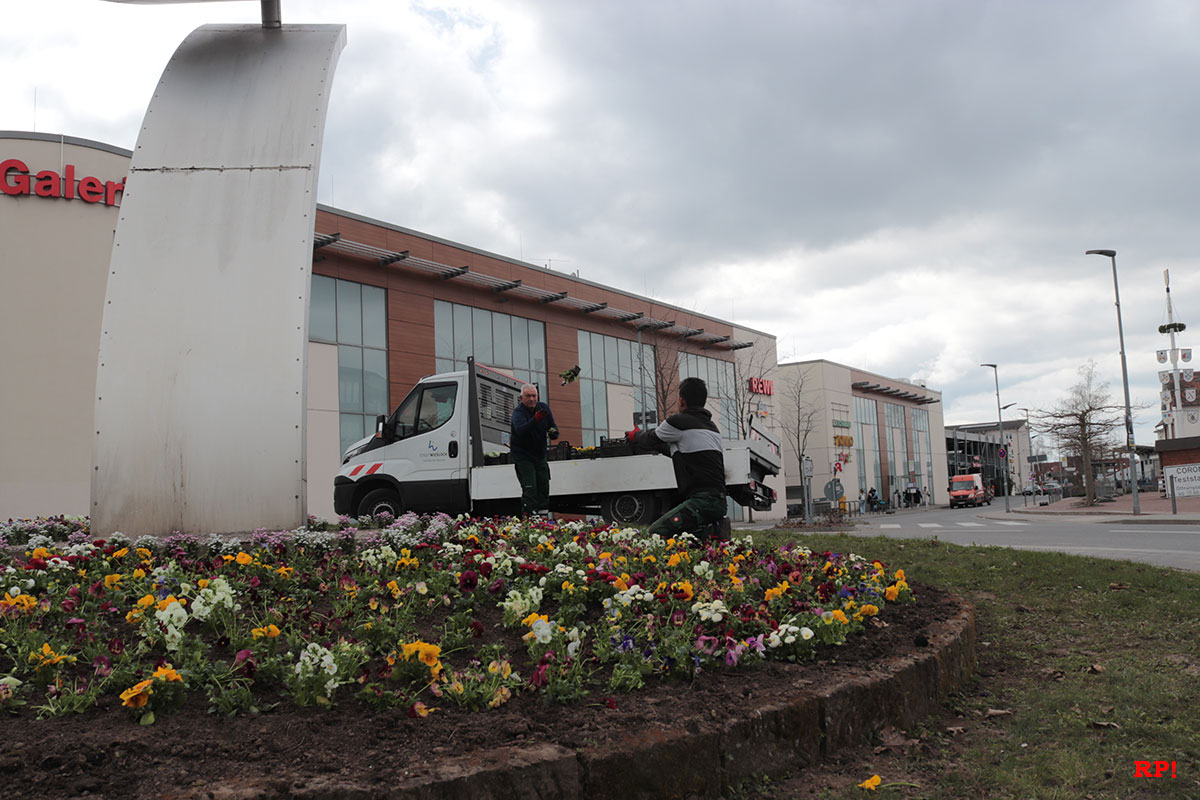 Das eingespielte Team pflanzt dazu Hunderte von bunten Blumen im Kreisel bei der Stadt-Galerie ein. Die harte Arbeit der Mitarbeiter des Bauhofs und der Stadtgärtnerei kann man immer wieder nur loben. Gerade bei körperlich anstrengender Arbeit ist effizientes Vorgehen wichtig. Grade zu in Akkordtempo zeigen die beiden Mitarbeiter wie Teamwork funktioniert. Der eine wirft und der andere pflanzt ein. Geradezu Guinnessverdächtig!