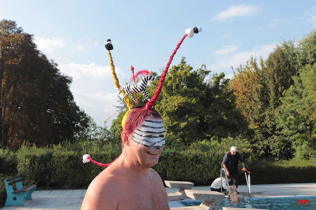 Ein Hundehalter zog beim Hundeschimmen in Wiesloch dieses Jahr die Aufmerksamkeit der Besucher auf sich. Aber nicht wegen seines Hundes, sondern aufgrund seines Aussehens. Er war zuvor beim Straßentheaterfestival in Brackenheim, dort machte er den Spaß mit und ließ sich „stylen“.