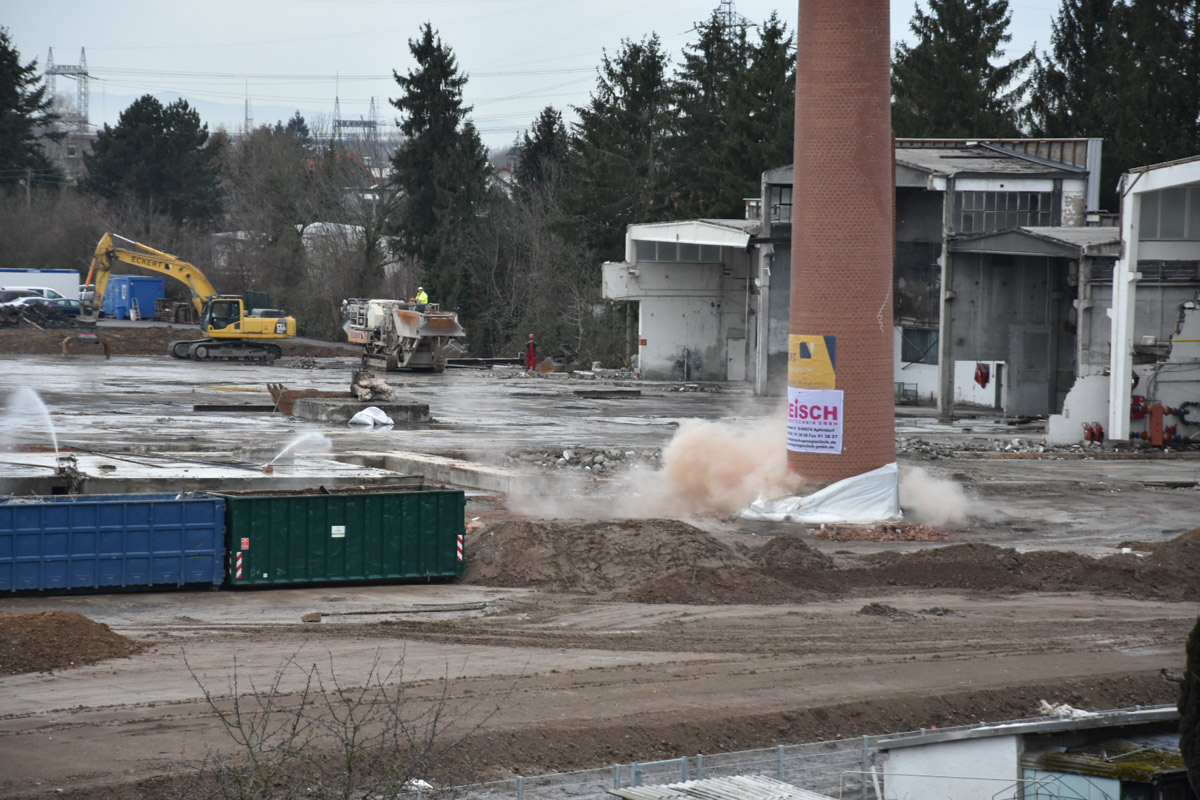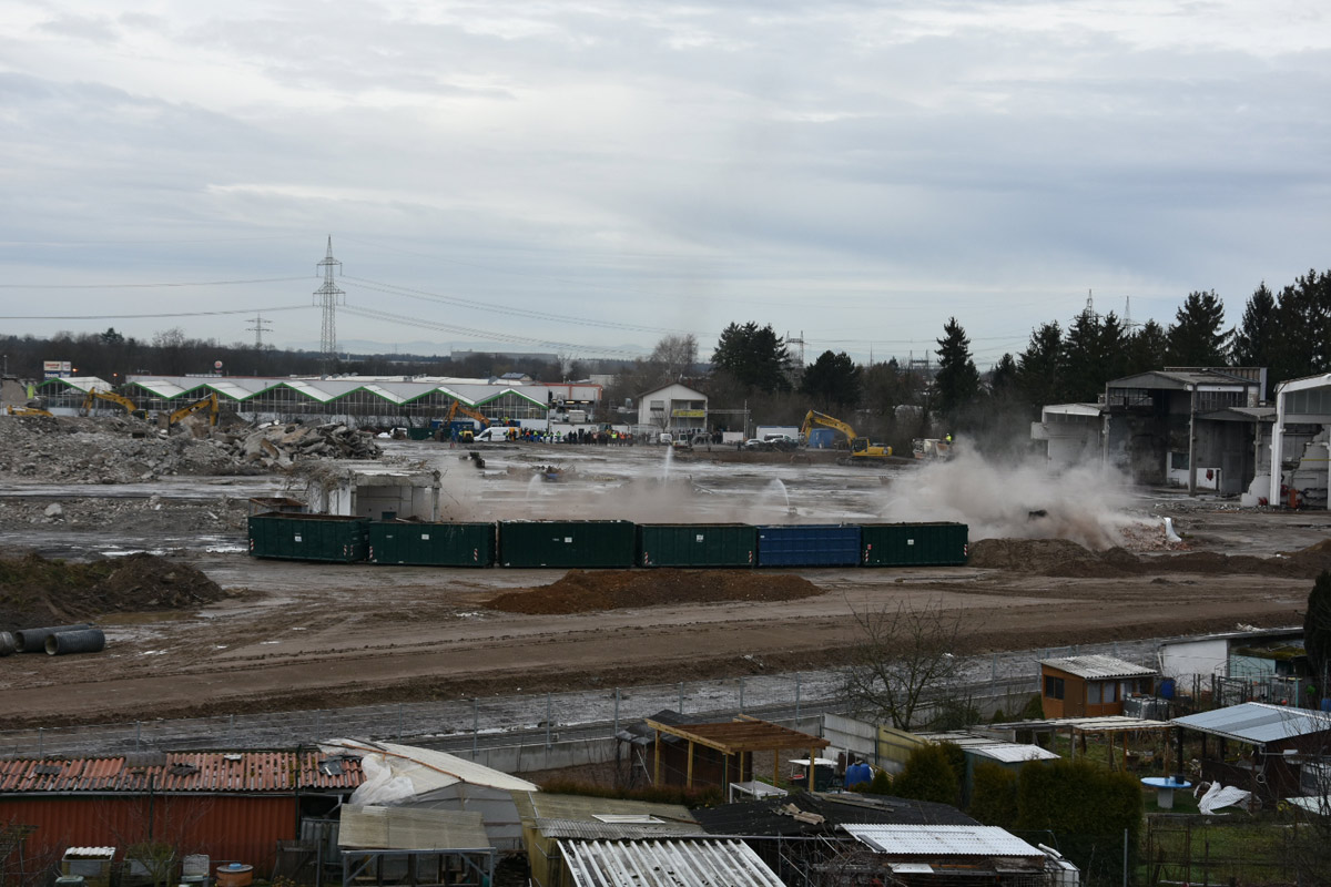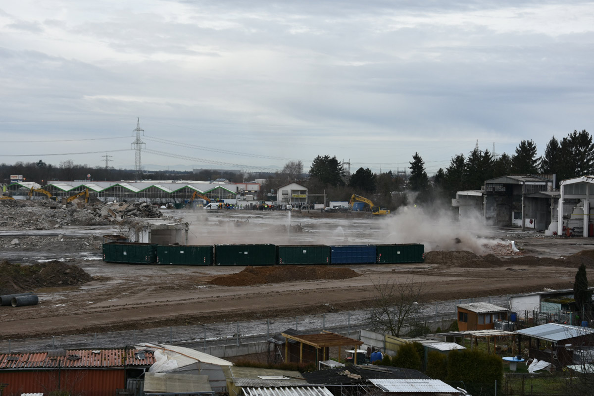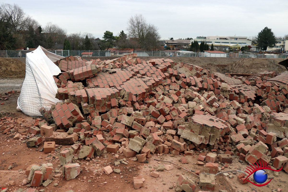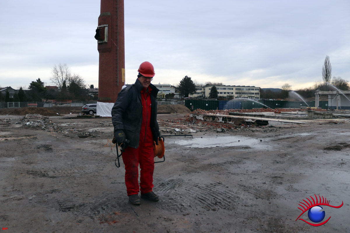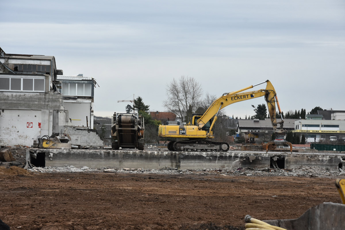 Die Firma ECKERT wird nun bis voraussichtlich Anfang April den Rest der Abrissarbeiten zu Ende führen. Die Industriehallen sind bis auf einen kleinen Rest beseitigt, es bleibt noch die Entfernung des Bodenbelages. Ein Teil wurde bereits ausgehoben.