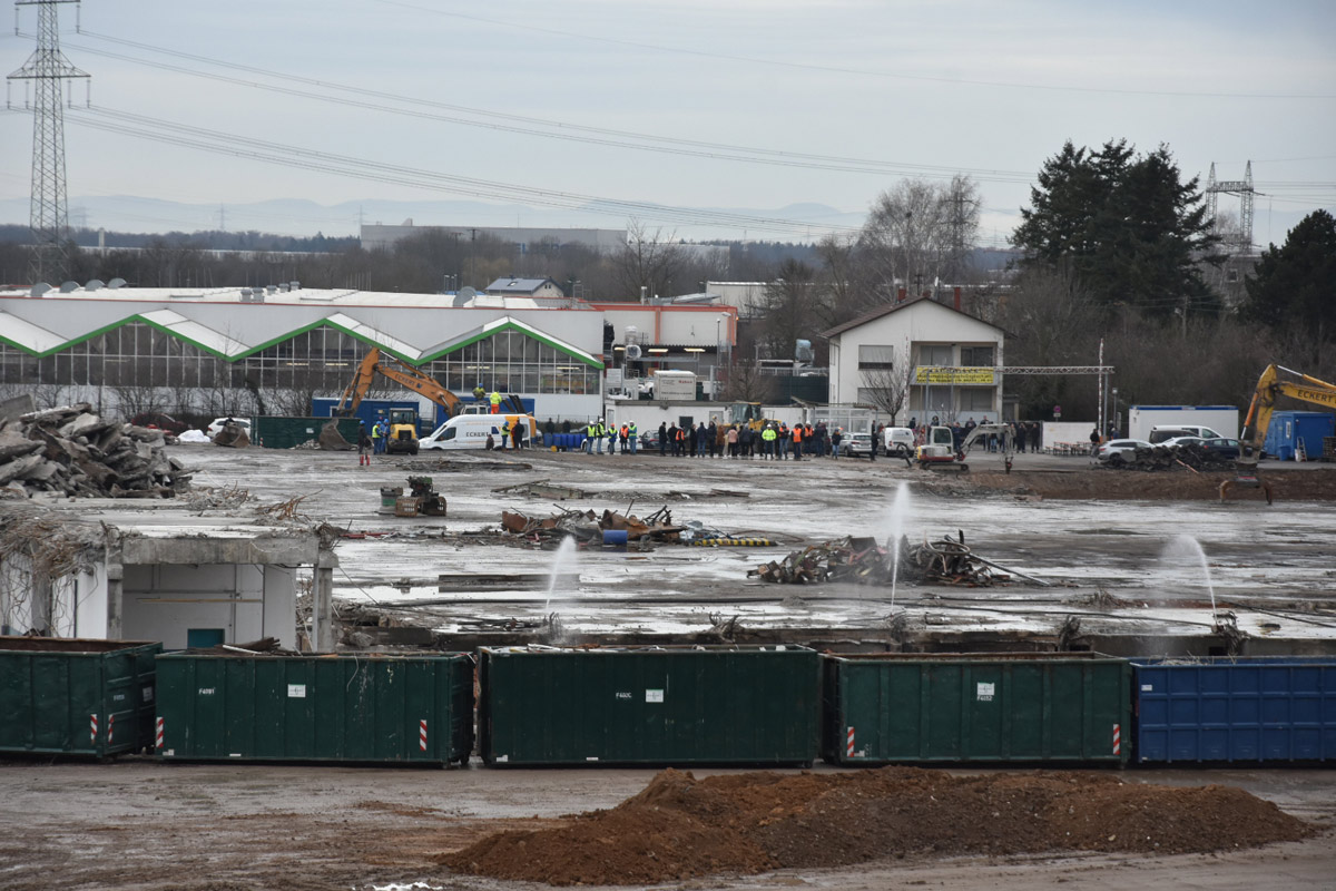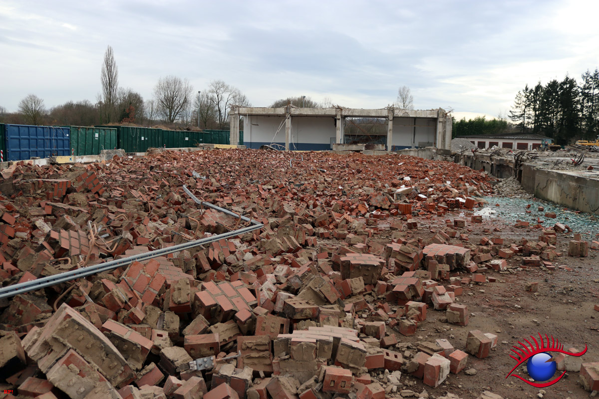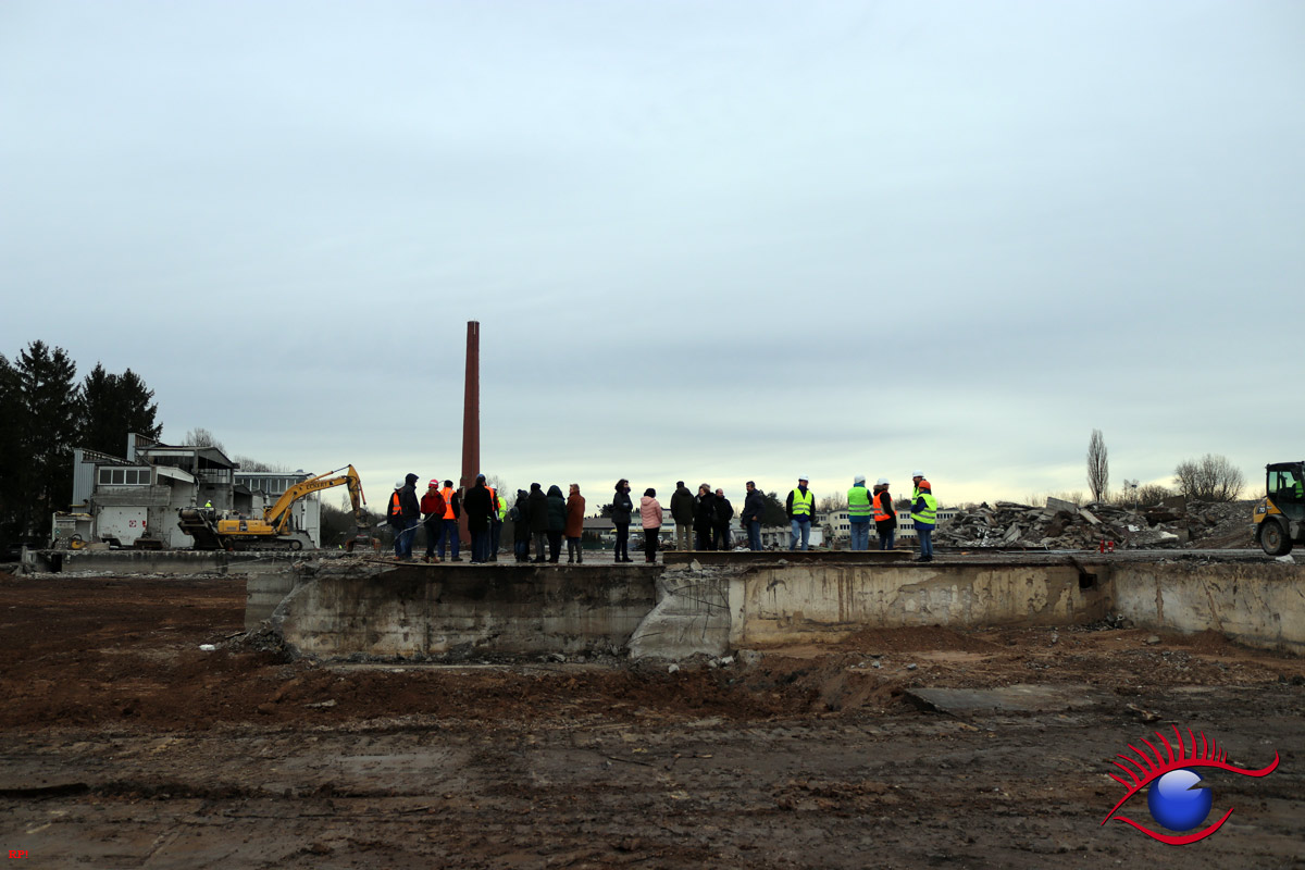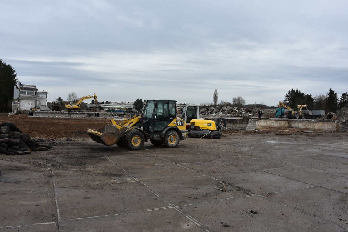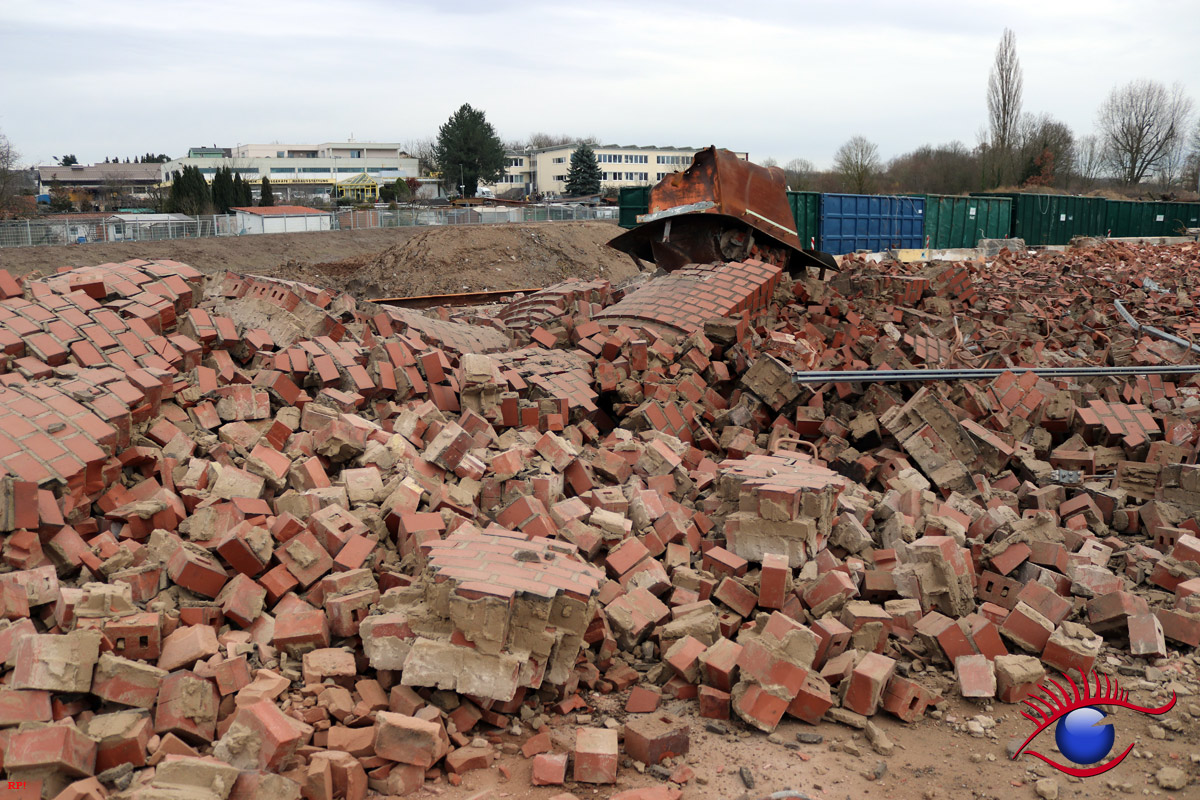 Die Firma ECKERT wird nun bis voraussichtlich Anfang April den Rest der Abrissarbeiten zu Ende führen. Die Industriehallen sind bis auf einen kleinen Rest beseitigt, es bleibt noch die Entfernung des Bodenbelages. Ein Teil wurde bereits ausgehoben.