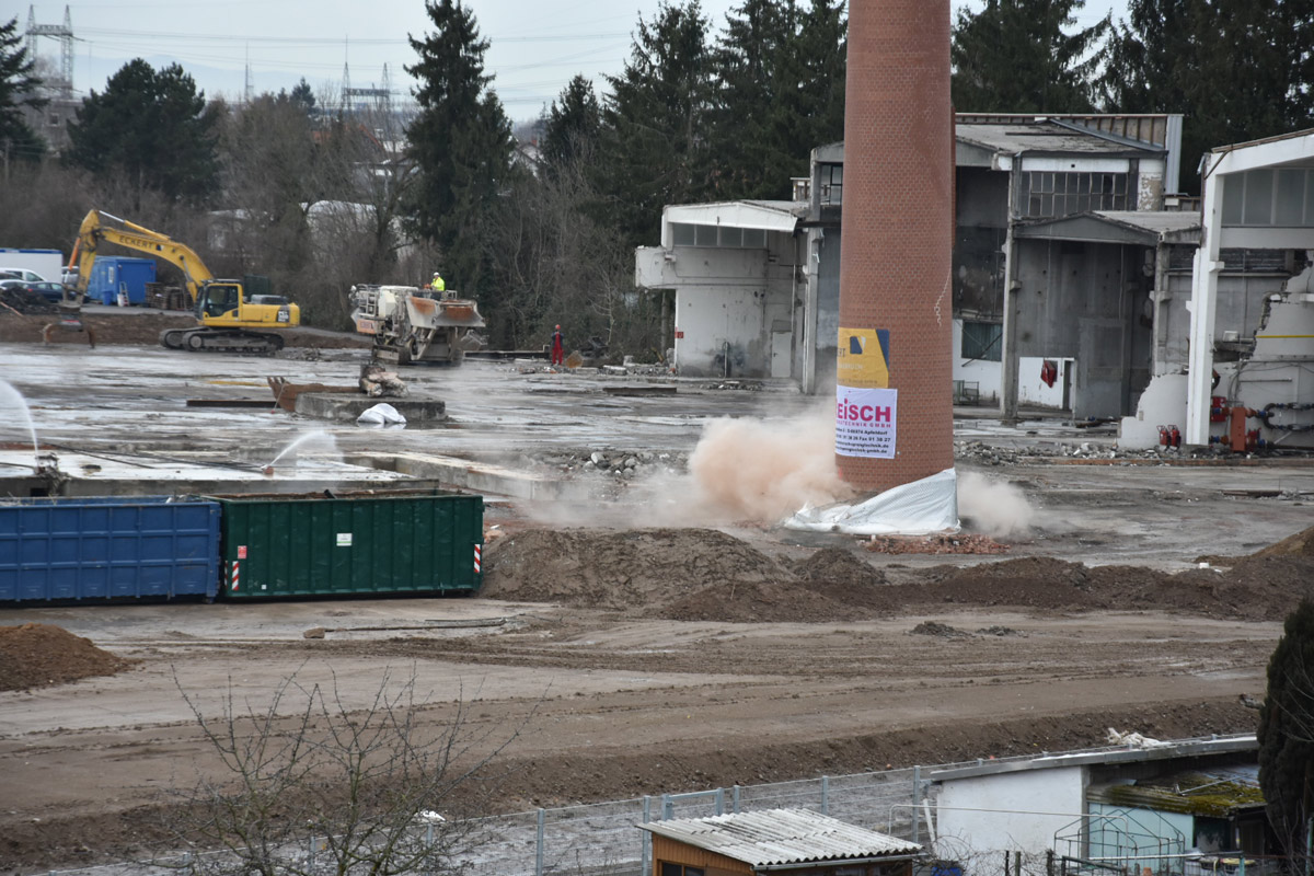 Lediglich 1,5 Kilogramm Sprengstoff kamen zum Einsatz bei der kontrollierten Sprengung des Industrieschornsteins der ehemaligen Holfelder Werke, auch bekannt als Wellpappe Wiesloch.
