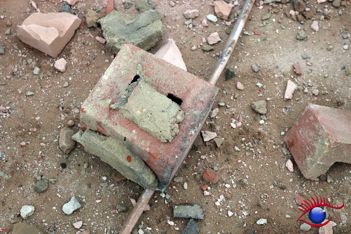 Verteilt auf 38 Sprenglöcher führte die Explosion dazu das der bis zu schätzungsweise 300 Tonnen schwere Schornstein bestehend aus Backstein in Bewegung geriet, um kontrolliert in die vorgesehene Richtung zu fallen.
