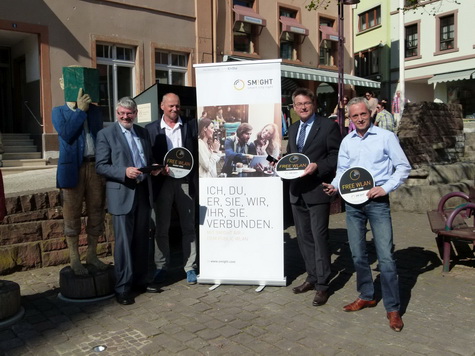 Oberbürgermeister Franz Schaidhammer, Meinrad Singler, Stadtverwaltung Wiesloch, der Leiter des Regionalzentrums Nordbaden Michael Gutjahr und Matthias Weis, der zuständige EnBW-Projektleiter, stellen in Wiesloch das neue öffentliche W Lan Angebot vor.