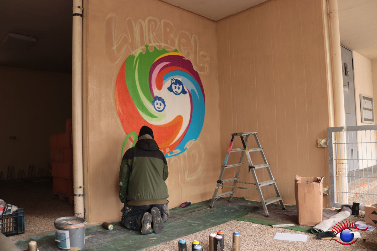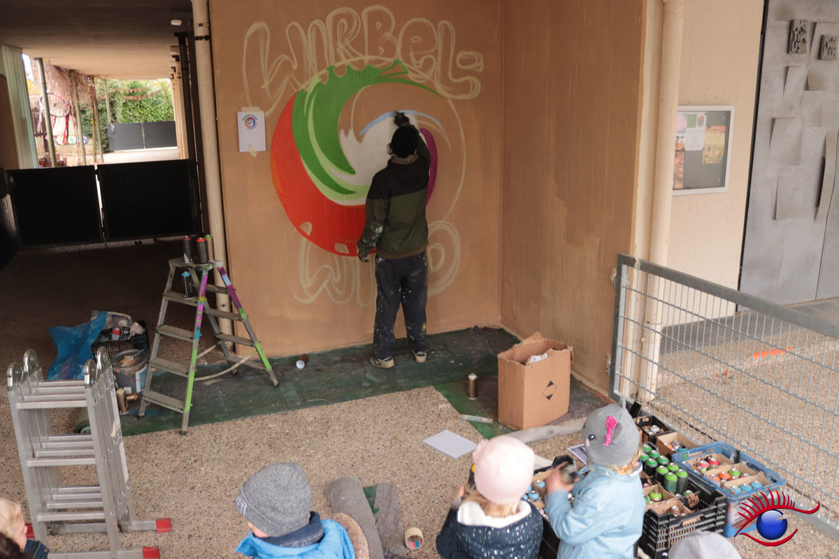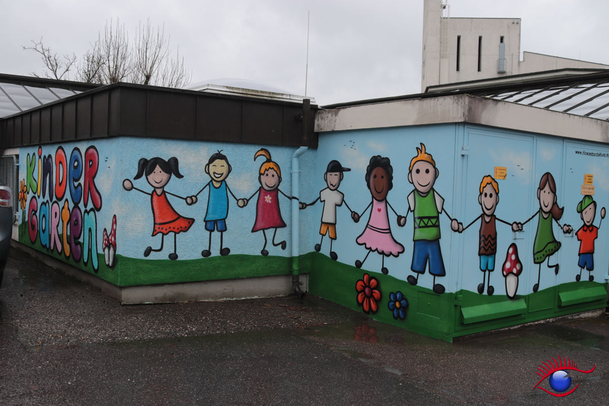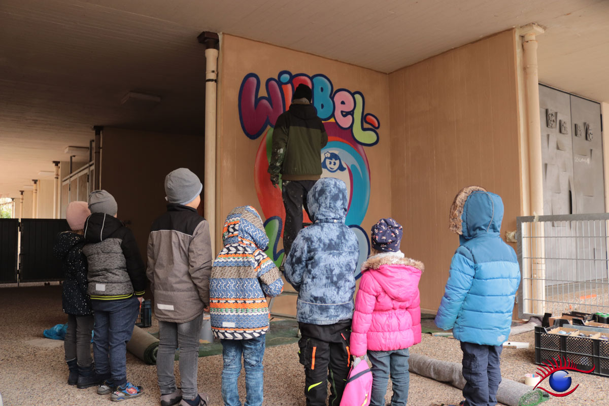 „Am 12. und 14.März war es endlich soweit, Marco Billmaier rückte mit seinen vielen Spraydosen im Kindergarten Wirbelwind an. Finanziert über „Projekte Rainer Kircher“ konnte endlich die Außenwand inkl. der angrenzende Trafostation sowie ein Teil der Kirchenwand in ein schönes Licht gerückt werden, denn oft wird der Kindergarten von außen gar nicht als solcher erkannt.“ berichtet Kindergartenleiterin Esther Philipp.