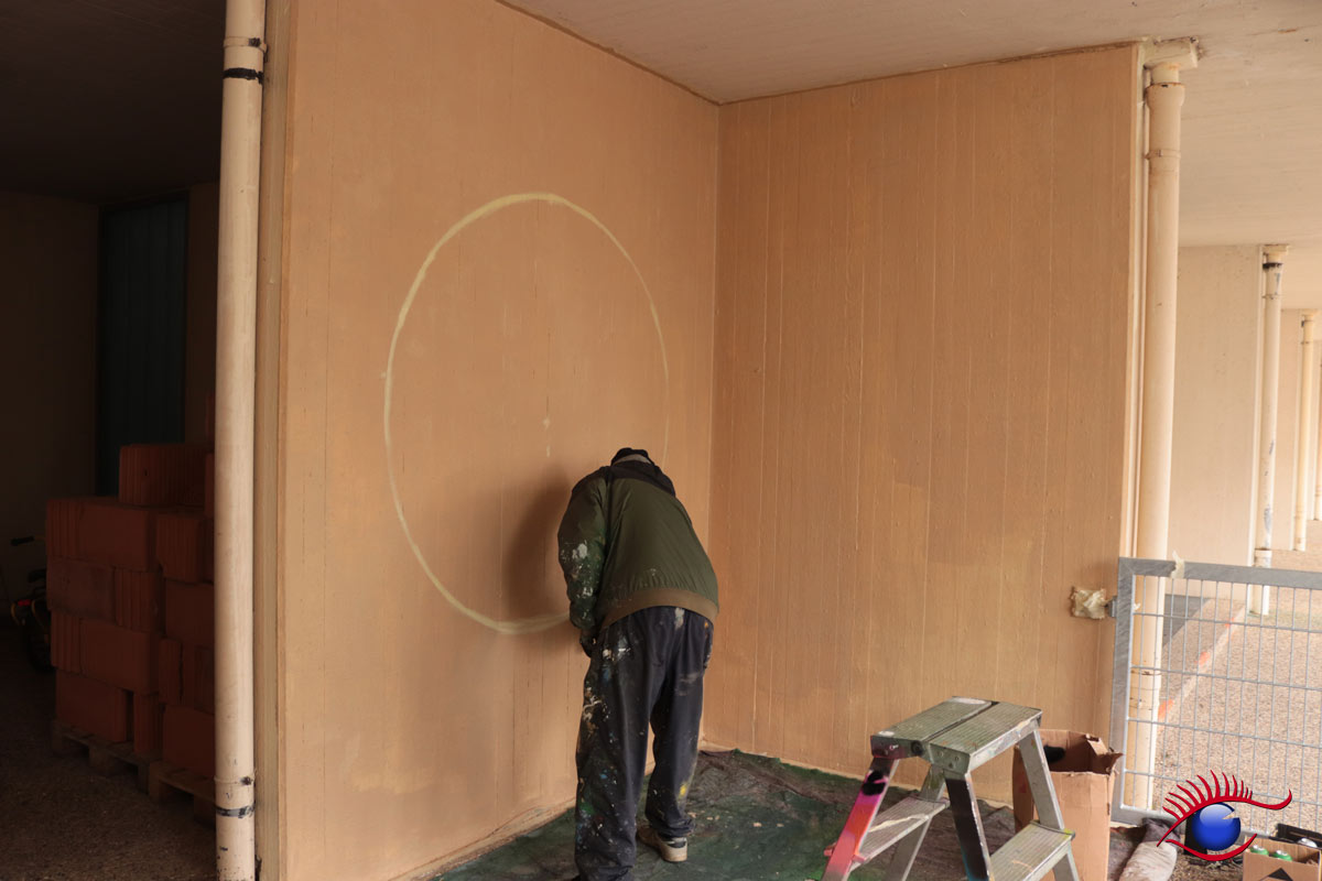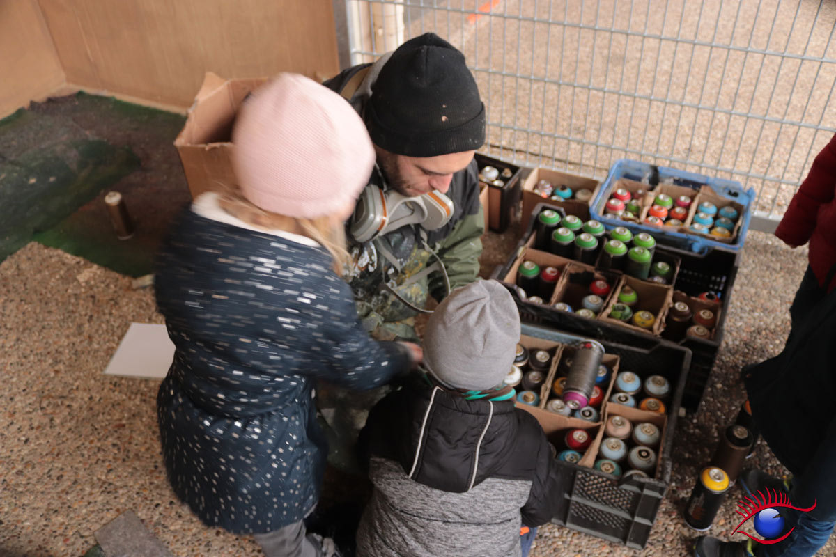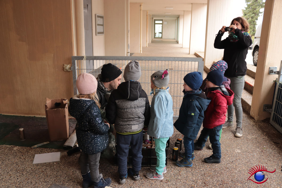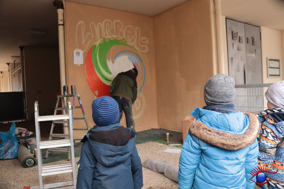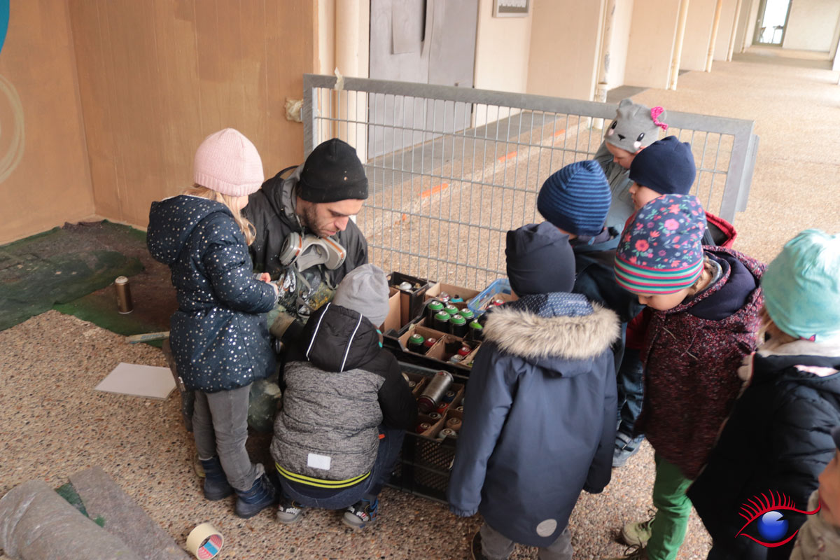 „Auch die Kindergartenkinder hatten die Möglichkeit zuzuschauen, da in der Herderstraße zum Glück kein Durchgangsverkehr ist und so konnten alle mitten auf der Straße sitzen und dem Graffiti-Auftrags-Spezialist bei seiner sehr gelungenen Arbeit zuschauen.“ so Philipp.