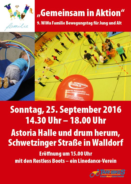 Am Sonntag den 25.09.2016 wird es zum 9. Mal heißen: WiWa Familie bewegt! Unter dem Motto „Wir bewegen Familien“ haben viele Vereine und Institutionen aus Wiesloch und Walldorf gemeinsam ein buntes Programm mit Sport, Spiel und Spaß für die ganze Familie aufgestellt.