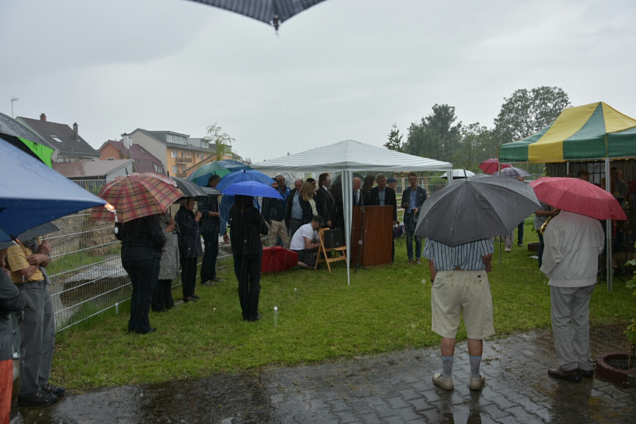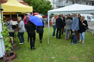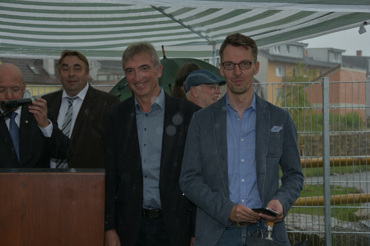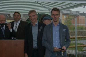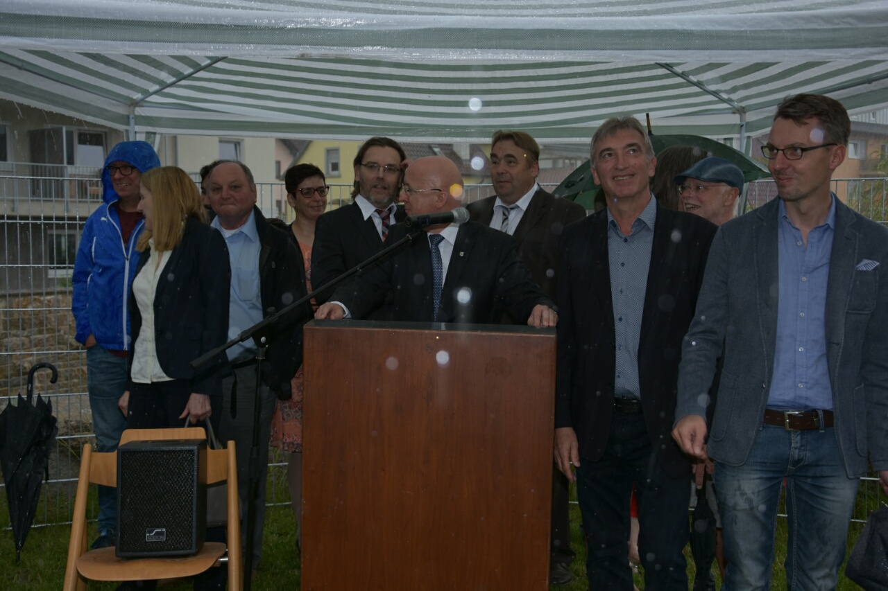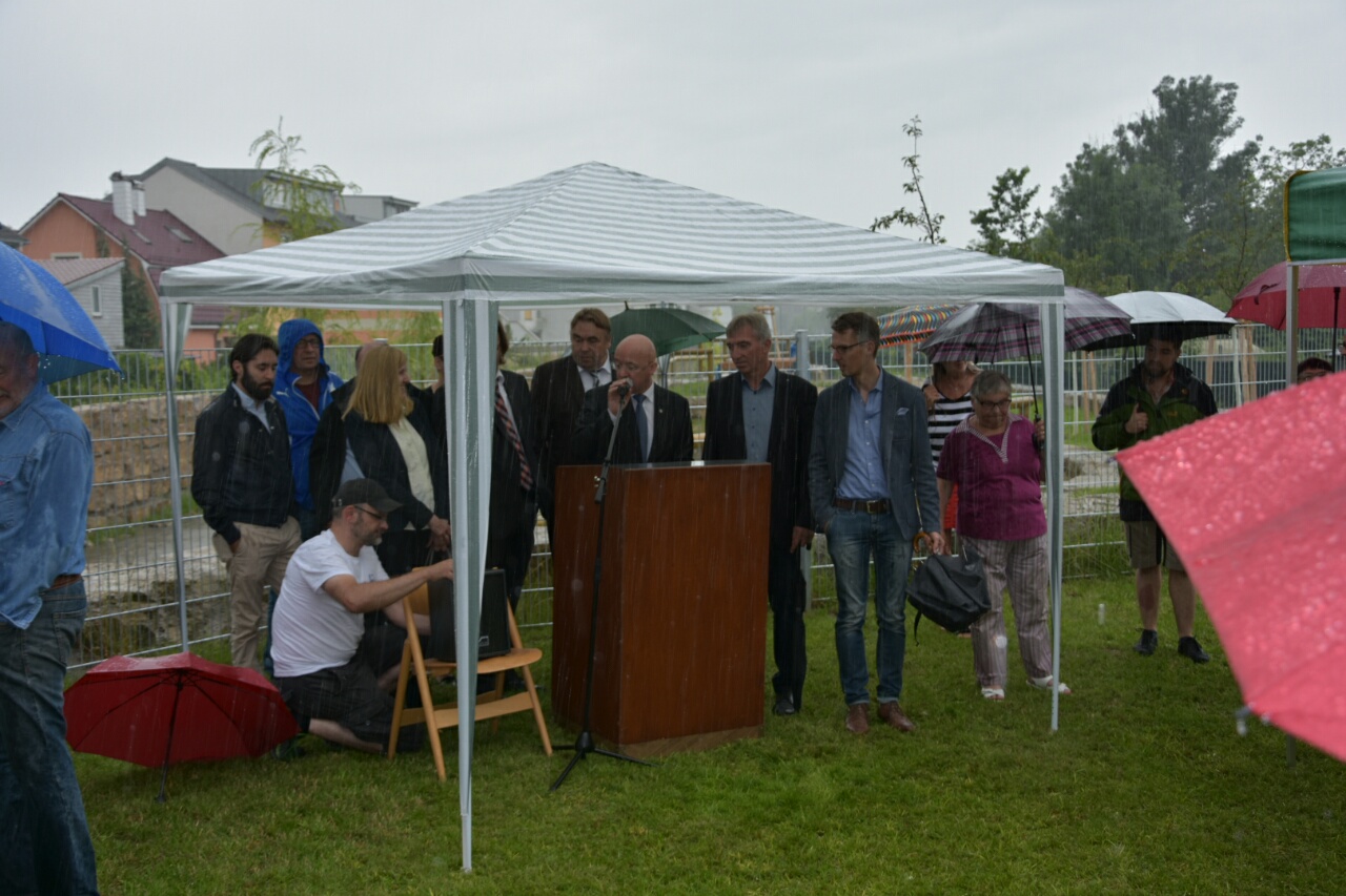 Pünktlich zur Eröffnung des neuen Leimbachabschnittes kam der Platzregen. Die Veranstalter hatten sich darauf eingestellt und sich vorsorglich auf die Freifläche der Stadtkapelle und deren Räumlichkeiten zurückgezogen. Bürgermeister Ludwig Sauer konnte in Vertretung von Oberbürgermeister Dirk Elkemann zahlreiche Ehrengäste aus dem Bundestag, dem Landtag, sowie Vertreter des Regierungspräsidiums und des Landkreises begrüßen. Auch wenn die Veranstaltung durch Wetterkapriolen ein bisschen beeinträchtigt sei, so habe man mit dem hochwassersicheren und ökologischen Ausbau des Leimbachabschnittes eine ehebliche städtebauliche Verbesserung für Wiesloch erreichten können. An erster Stelle stehe natürlich der Schutz vor Hochwasserereignissen . Durch den Bachausbau habe man Sicherheit für die Anlieger schaffen können. Das erste große Hochwasser von Ende Mai diesen Jahres habe das neue Gewässer mit Bravour gemeistert. So sei die Bebauung des ehemaligen Postgeländes mit 49 Wohnungen durch den Gewässerausbau erst genehmigungsfähig geworden. Auf den Gewässerunterhaltungsweg sei eine attraktive Rad- und Fußwegverbindung entstanden, die zum Flanieren einlade und vor allem für Kinder und ältere Menschen eine sichere Verbindung zur Innenstadt, bzw. in Richtung Wieslocher Westen darstelle. Der Bach sei wieder erlebbar geworden und es gebe einen Gewässerzugang, der zum Verweilen und Spielen einlade. Der Rad- und Fußweg sei Teil der im vergangenen Jahr eröffneten Leimbachroute. Darüber hinaus wäre der ehemalige Engpass im Bereich der alten Brücke beseitigt worden und die Gewichtsbegrenzung sei aufgehoben worden. Der Kindergarten West habe ein neues Außengelände erhalten und die Kleingartenbesitzer neue Gartenzäune und Türen.
