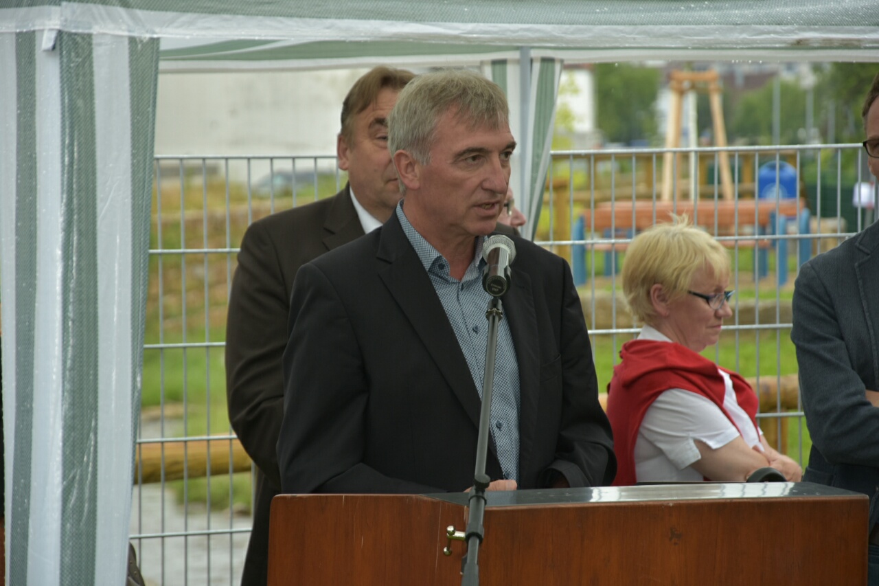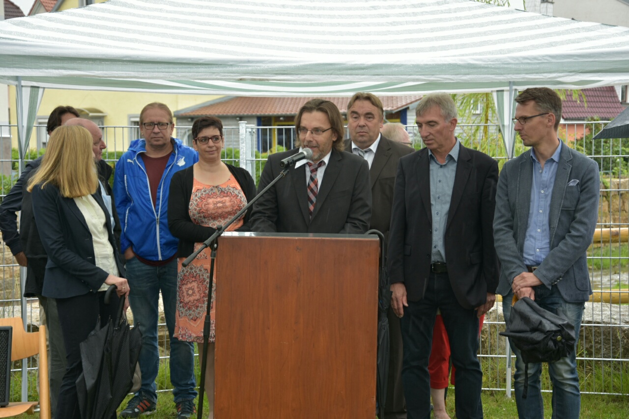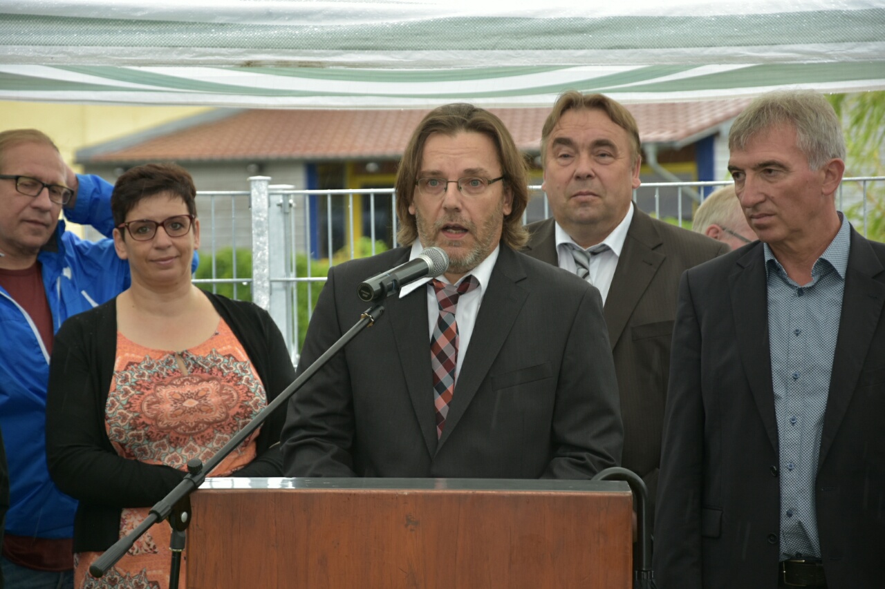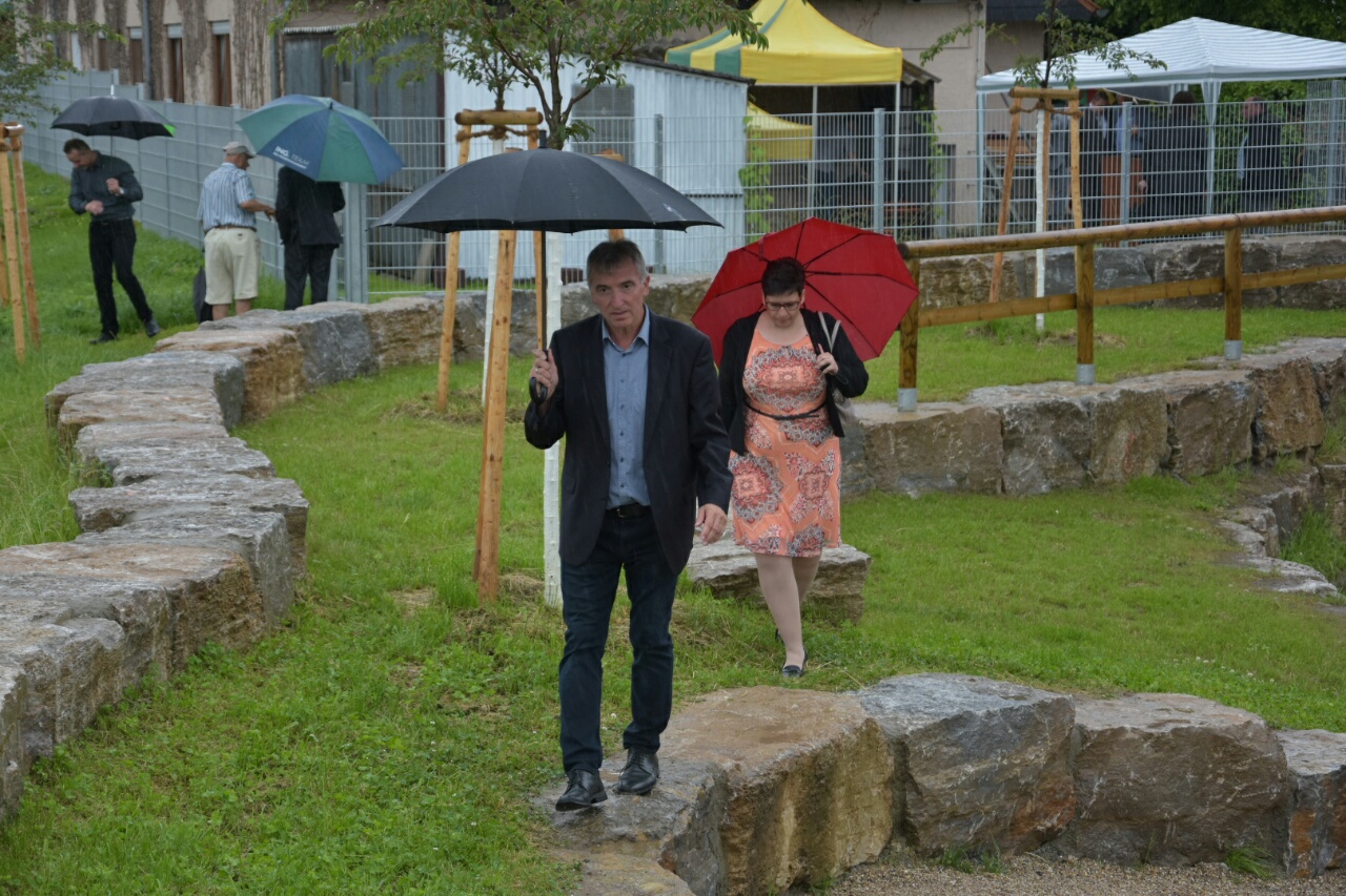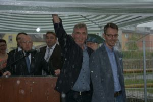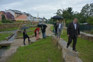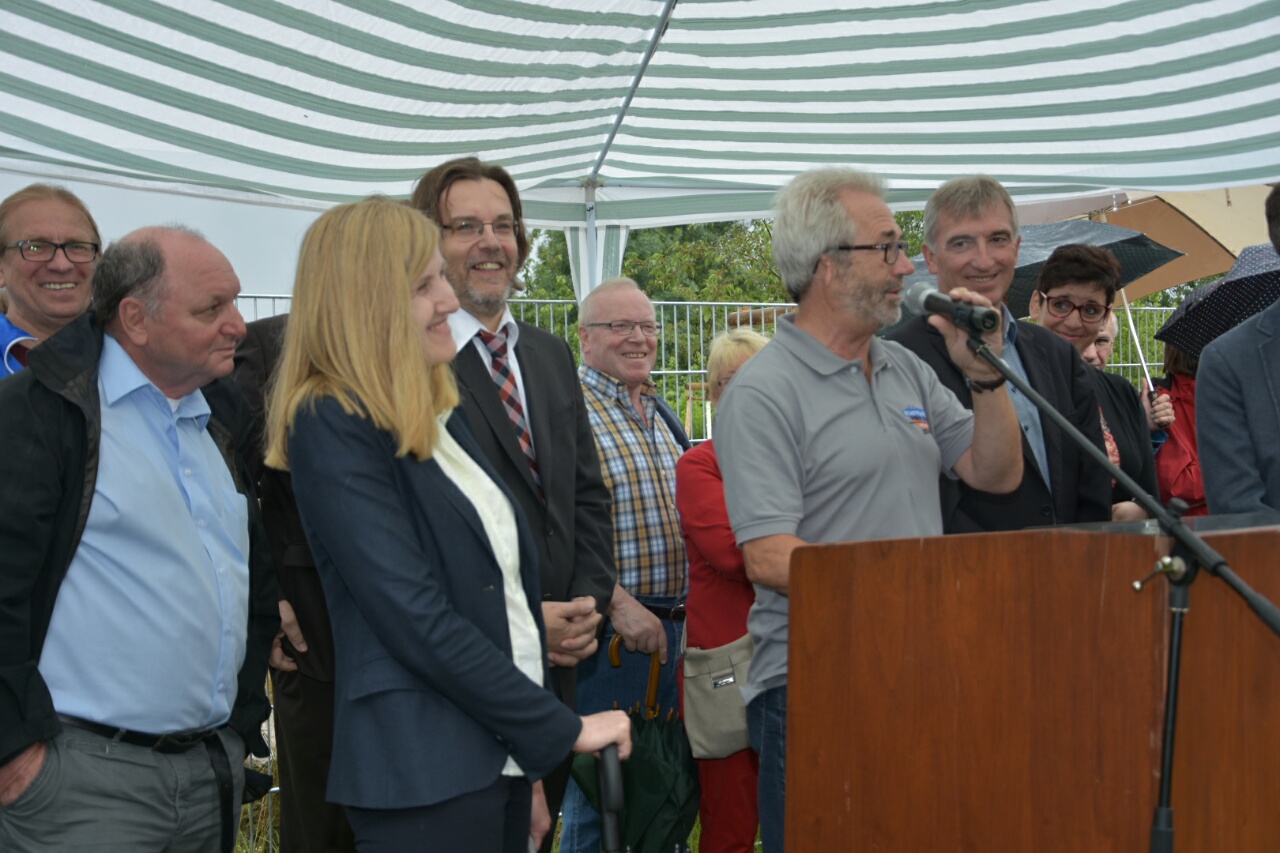 Pünktlich zur Eröffnung des neuen Leimbachabschnittes kam der Platzregen. Die Veranstalter hatten sich darauf eingestellt und sich vorsorglich auf die Freifläche der Stadtkapelle und deren Räumlichkeiten zurückgezogen. Bürgermeister Ludwig Sauer konnte in Vertretung von Oberbürgermeister Dirk Elkemann zahlreiche Ehrengäste aus dem Bundestag, dem Landtag, sowie Vertreter des Regierungspräsidiums und des Landkreises begrüßen. Auch wenn die Veranstaltung durch Wetterkapriolen ein bisschen beeinträchtigt sei, so habe man mit dem hochwassersicheren und ökologischen Ausbau des Leimbachabschnittes eine ehebliche städtebauliche Verbesserung für Wiesloch erreichten können. An erster Stelle stehe natürlich der Schutz vor Hochwasserereignissen . Durch den Bachausbau habe man Sicherheit für die Anlieger schaffen können. Das erste große Hochwasser von Ende Mai diesen Jahres habe das neue Gewässer mit Bravour gemeistert. So sei die Bebauung des ehemaligen Postgeländes mit 49 Wohnungen durch den Gewässerausbau erst genehmigungsfähig geworden. Auf den Gewässerunterhaltungsweg sei eine attraktive Rad- und Fußwegverbindung entstanden, die zum Flanieren einlade und vor allem für Kinder und ältere Menschen eine sichere Verbindung zur Innenstadt, bzw. in Richtung Wieslocher Westen darstelle. Der Bach sei wieder erlebbar geworden und es gebe einen Gewässerzugang, der zum Verweilen und Spielen einlade. Der Rad- und Fußweg sei Teil der im vergangenen Jahr eröffneten Leimbachroute. Darüber hinaus wäre der ehemalige Engpass im Bereich der alten Brücke beseitigt worden und die Gewichtsbegrenzung sei aufgehoben worden. Der Kindergarten West habe ein neues Außengelände erhalten und die Kleingartenbesitzer neue Gartenzäune und Türen.