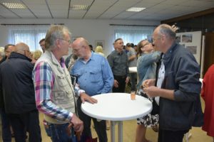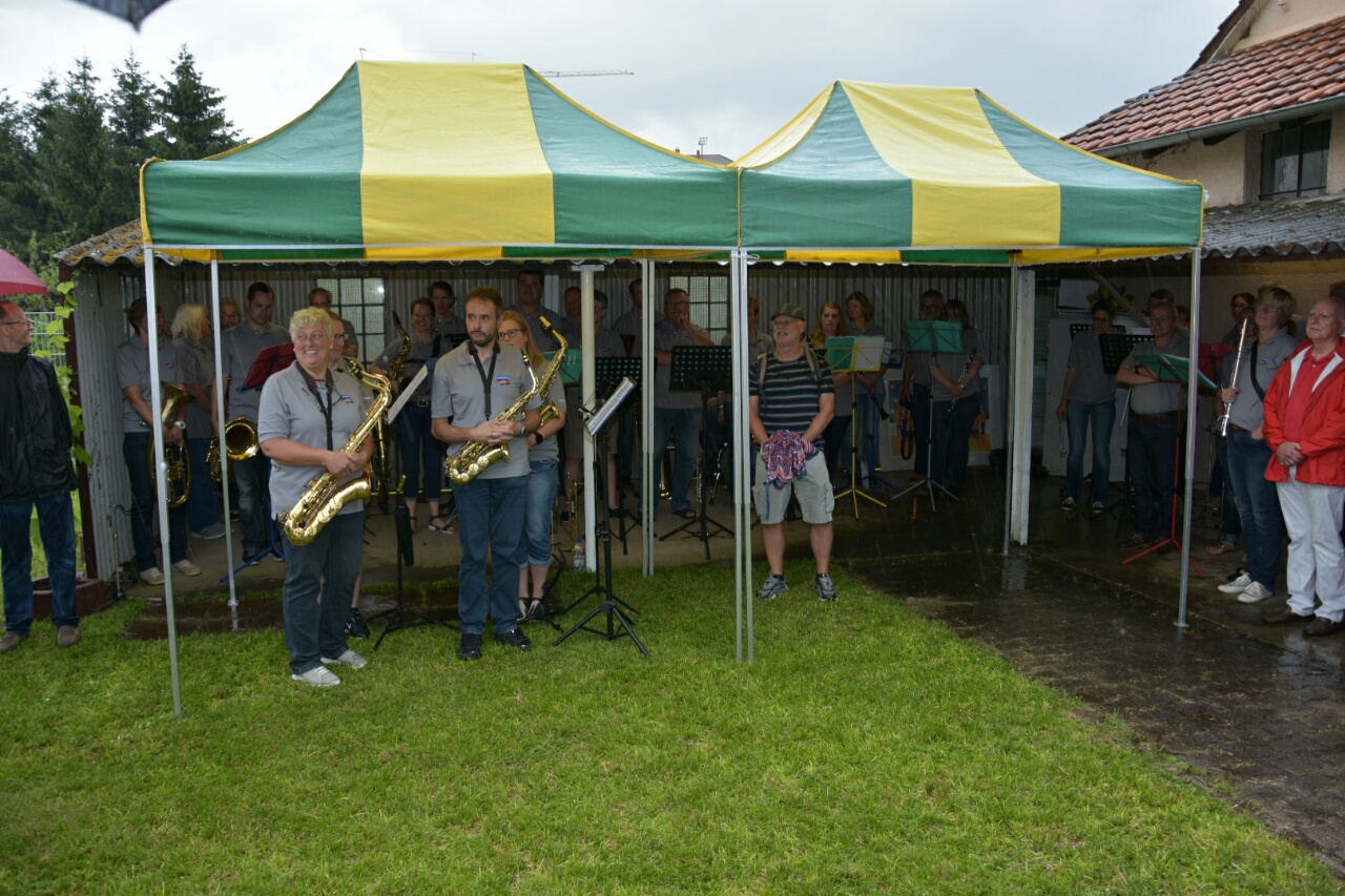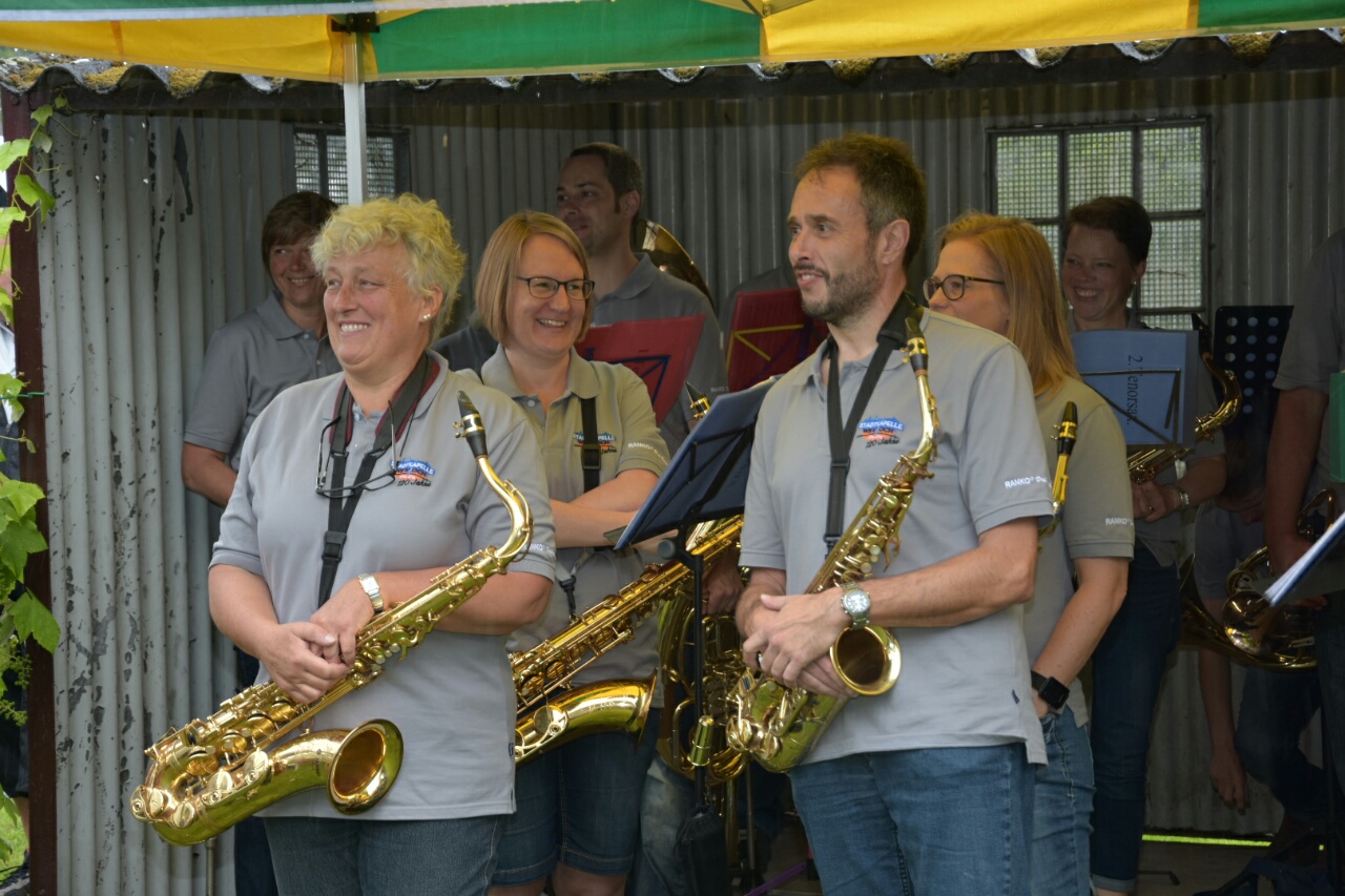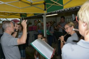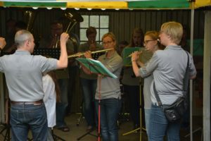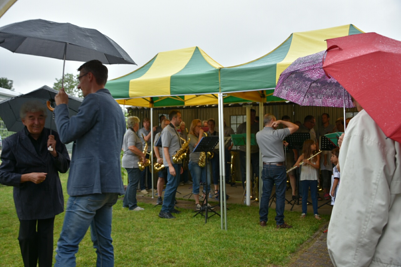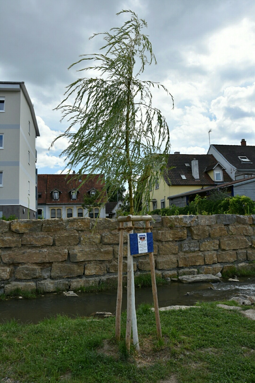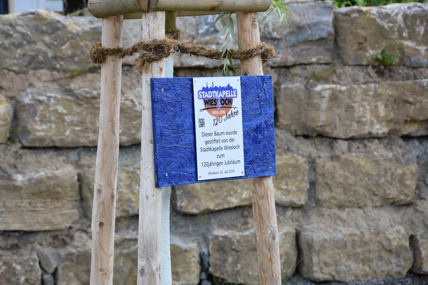 Bevor die Stadtkapelle das Badnerlied spielt ergriff der Vorstand Sven Kummerow das Wort und wies daraufhin, dass die Stadtkapelle Wiesloch die Patenschaft für die beiden Trauerweiden auf der Insel übernommen habe. In den Räumlichkeiten der Stadtkapelle waren Plantafeln mit Fotos vor der Baumaßnahme, während der Bauarbeiten und bei den Hochwasserereignissen vom Mai 2016 aufgehängt.